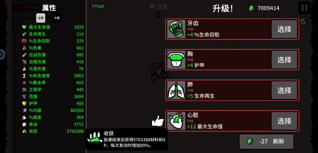 经济永远是最重要的,也是最基础的,有了钱,实现经济自由,就可以无敌了。 谈谈最左下角的收获,这也是本次开挂的关键。每回合结束,我们可以从收获中获取收获当中的数量的材料,即我们所需要的钱,只有前20波会有所增加,无尽,20波以后会开始减少。增加幅度,初始只有5%,后边可以拿道具,王冠,加8%。 如何增加收获提升,我们可以借助天赋卡,可以抽出近战伤害的,词条为,敌袭结束时,收获提高5%。一级为5%,用