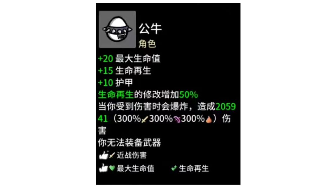 一直觉得公牛这英雄的强度不高,主要是因为它无法使用武器,且很多属性吃不到加成(比如攻速、暴击、范围等) 但今天偶然间玩了一把才发现公牛才是土豆里面唯一的T0英雄,只需要无脑拿爆炸伤害和爆炸范围加成道具就能有突破天际的伤害,同时也因为它不需要攻速暴击范围等主要属性,升级以及刷道具的时候可以把大量选择留给其他属性,就能快速在前期叠加伤害或者防御,如果稍微用心经营下真就两个字【无敌】!我还能说什么,大公