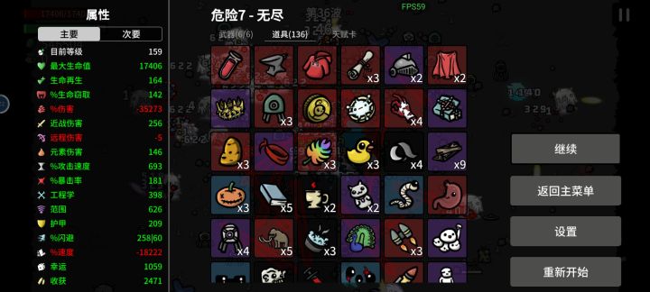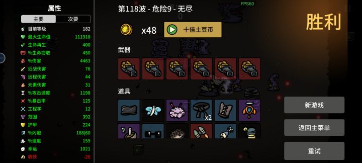 无尽含金量最高的攻略,轻松一百层。字有点多,耐心看完,大有收获。攻略核心:20层之前靠收获天赋卡+道具王冠[9%的收获加成]+储钱罐囤材料,然后趁商店物价还没涨起来之前大量买进道具。配置:一套全【收获】天赋卡,建议升一下等级。我的配置是3张成长的天赋卡【一共+18%】,然后剩下的都是普通收获卡。具体操作:1.开局选【辅助】武器,比如[花园剪刀][掌]2.前几波结束后,升级优先选[收获