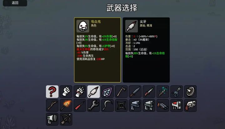 11吸血鬼不玩尖牙还玩什么?只需要注意多拿护甲闪避防暴毙12无脑强。前期优先凑满武器,多拿诅咒道具滚雪球即可。13凑六把近战武器,建议板砖起手,前期一砖一个小朋友。多买不同道具即可。14前期别吃任何材料,只要一把弹弓,靠收获买弹弓把弹弓升满级。炮塔快满级就可以吃点材料保命了。15武器词条好还能加经验,前几波可以多留武器栏,直接买了木棍合成,请不动怪再多带几把16无脑强,随便打