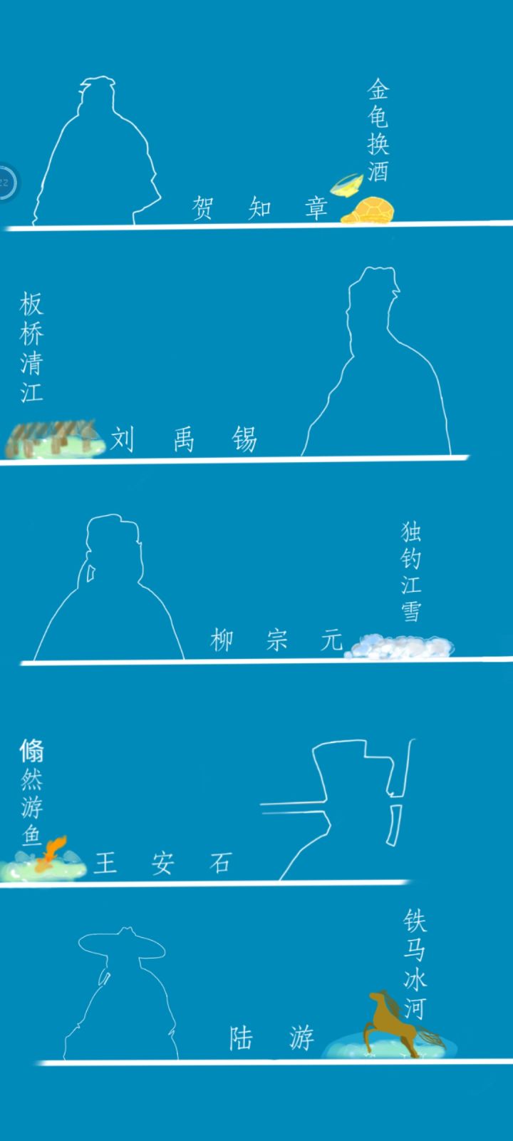 没有想到诗还能做成游戏,很新颖,有趣!给家里的小孩子玩儿了几分钟,小孩子认为很有趣,有点不想撒手😂😂建议配乐选择更古风的乐曲,更有带入感😁