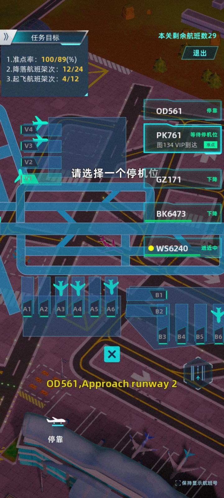 这游戏难度不低,但论坛却找不到一个有深度的攻略。这里以最后一关15-8为例,总结一下通关技巧。①全局图缩放15关开始,会解锁手动选择停机位,而默认的全局图是不能全部显示的,那么要不停的来回滑动,在后期操作极限的情况下,基本必出错。如图所示,国际与货运不能同时显示。但缩放以后,右侧提示信息,很容易会占据国内滑行跑道!这个是致命的。双指即可缩放,一定要把国内滑行跑道,尽可能往左下角拉,避免被右