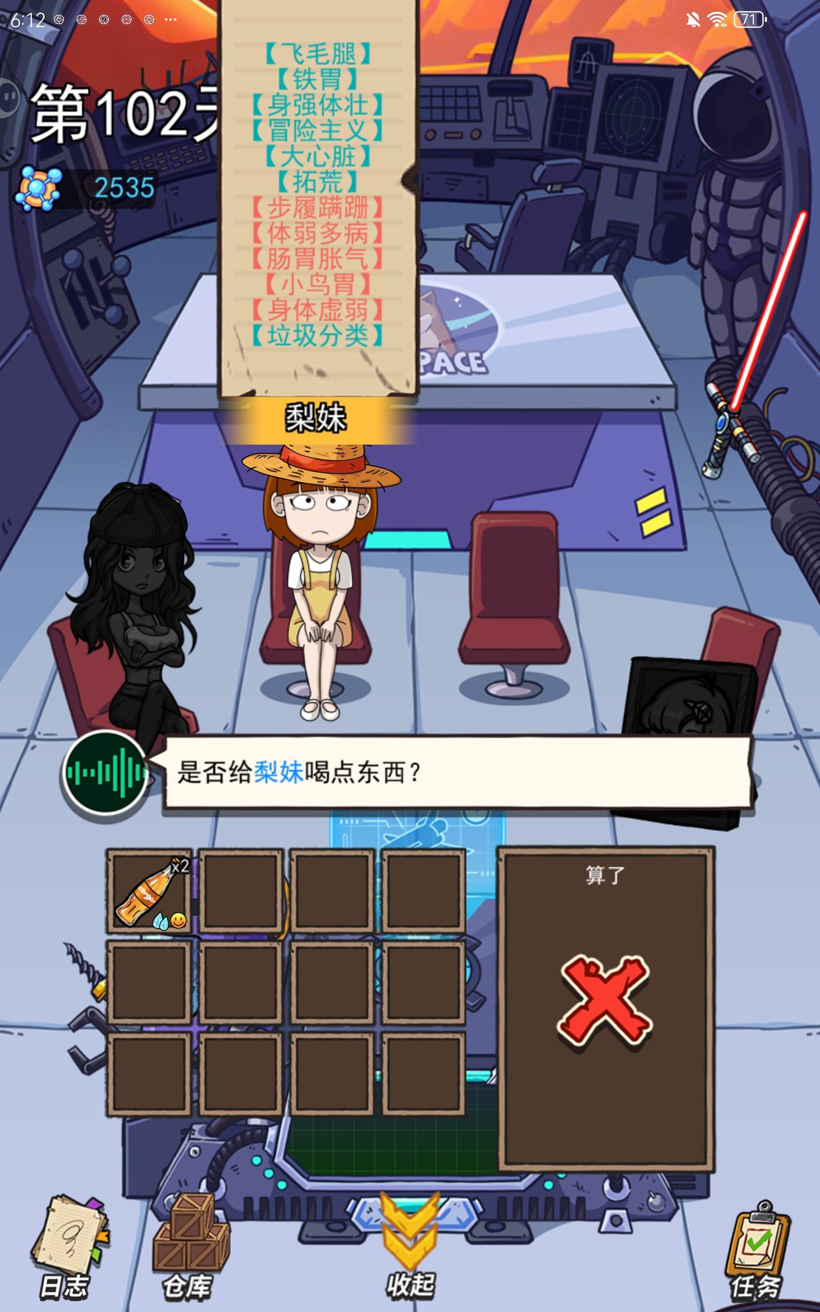 1、关于仓库的问题。我看论坛里也有不少玩家提出这个,确实也是,如果开局就抽到几大桶水,那么其他的食物饮料道具包括武器什么的,就会装不下。这里我的建议是,要么开第二页仓库,要么搞个道具强化系统,消耗资源强化到一定程度,减少格子占位。