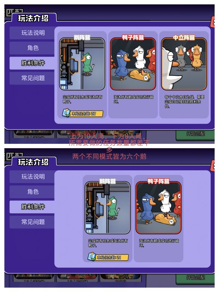 先说底层设计,鹅鸭杀的底层设计是优秀的。三阵营设计加双重胜负机制加随机角色池子。共同构筑起了一套随机性超高且内容丰富的“对局可能性”。使鹅鸭杀在可玩性上甚至接近肉鸽游戏。