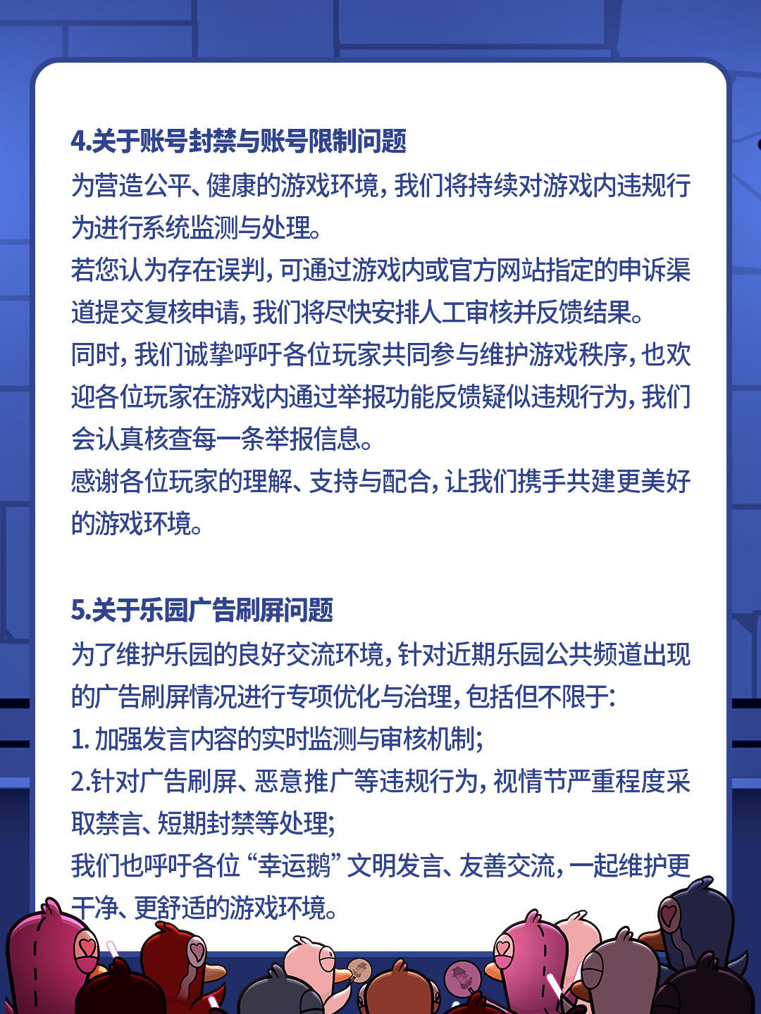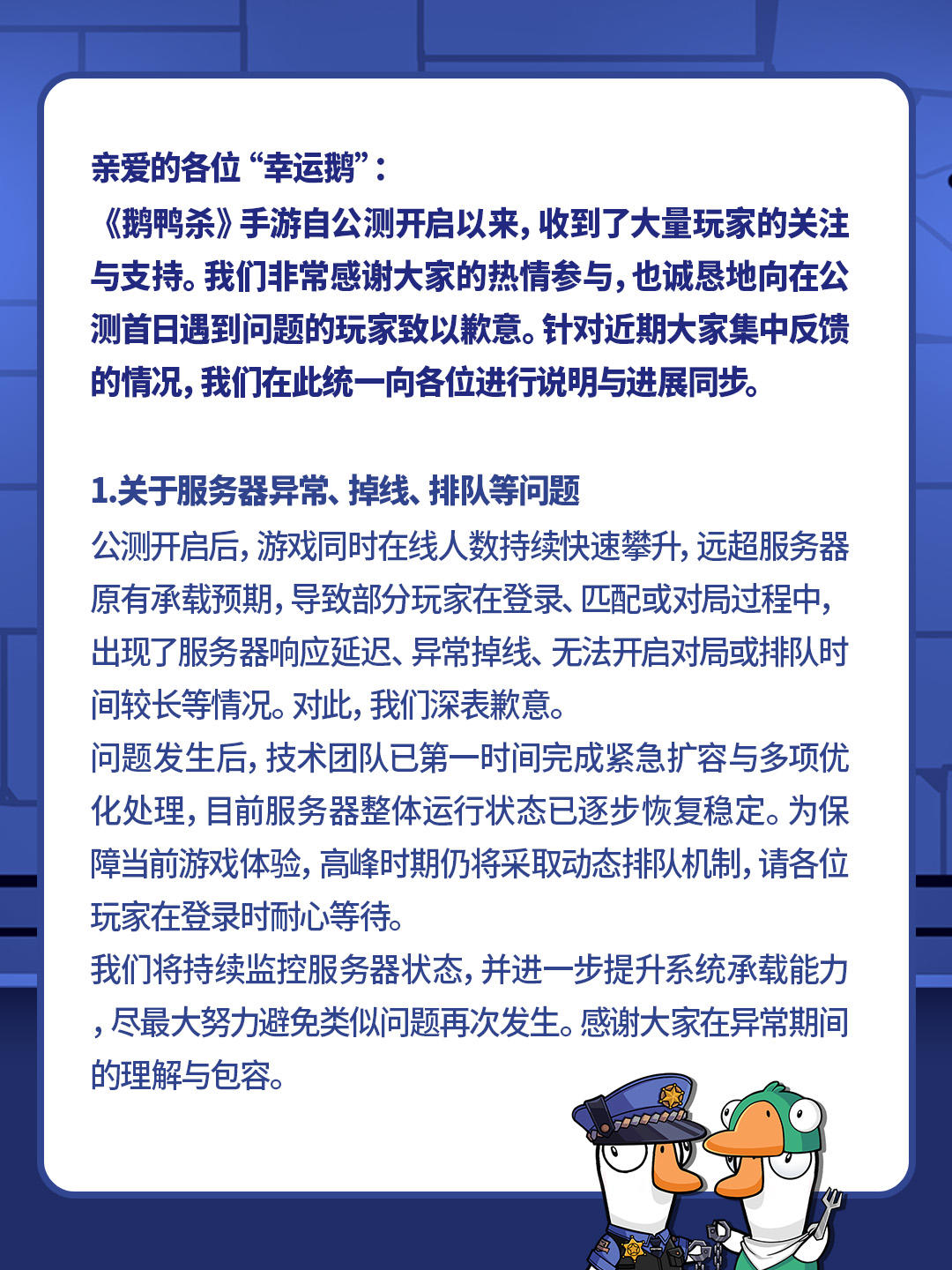 亲爱的各位“幸运鹅”:《鹅鸭杀》手游自公测开启以来,收到了大量玩家的关注与支持。我们非常感谢大家的热情参与,也诚恳地向在公测首日遇到问题的玩家致以歉意。针对近期大家集中反馈的情况,我们在此统一向各位进行说明与进展同步。#鹅鸭杀 #鹅鸭杀公测 ##鹅鸭杀手游 #发现好游戏 #游戏日常