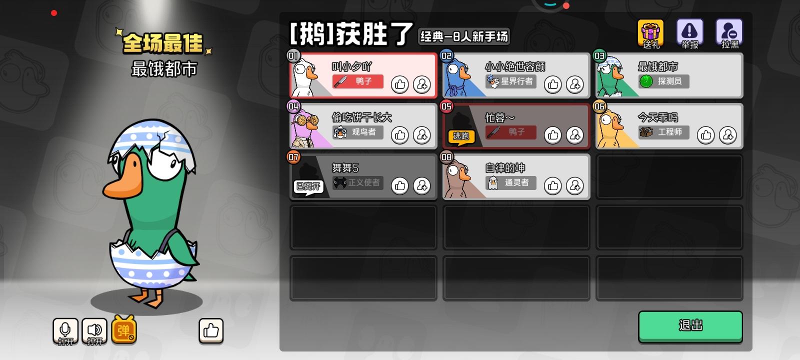 有一起鹅鸭杀的宝子吗,在q建了一个群新手有首刀保护(13号就没保护了)。目前群里有119个人了,不想要很多规矩,主打开心玩耍,要来的看主业