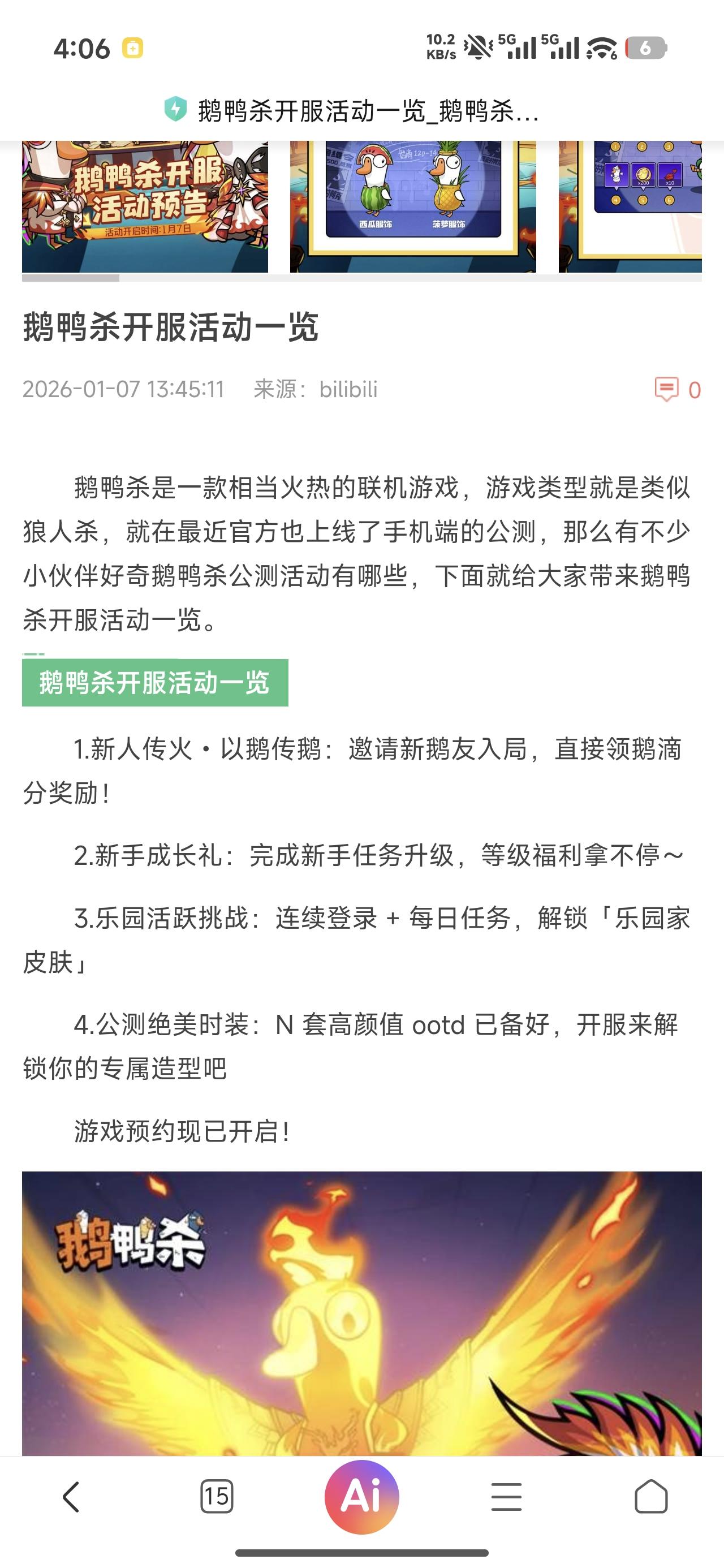 鹅鸭杀S1赛季[锦羽迎春]即将上线!国服首个原创角色“锦鸡”将在S1赛季重磅上新,发红包,放鞭炮,做年夜饭...解锁新年新玩法;春节主题活动与限定时装同步登场,鹅鸭同聚,共闹新春!更多S1赛季内容,将陆续公布,敬请期待~评论有奖在评论区分享对锦鸡的技能和玩法猜想,抽3人送出鹅鸭杀限定春联周边~限量红包封面领取:鹅鸭杀手游火热下载中σ ゚∀ ゚)σ 各位幸运鹅准备好开启新的「整活」之