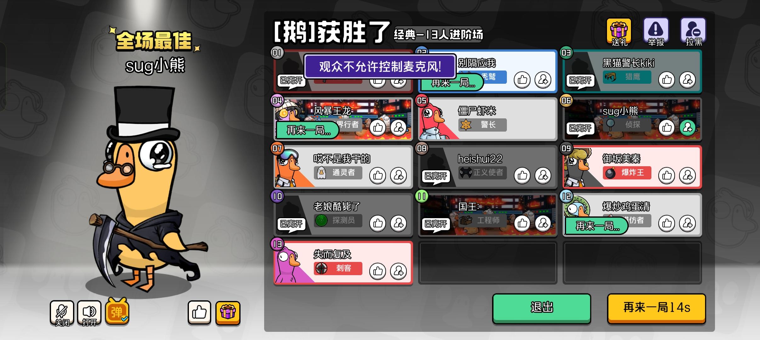在对局中阵亡后一直附在别人身上观战,游戏结束后还显示这个禁止发言。都结束了还禁止干什么#