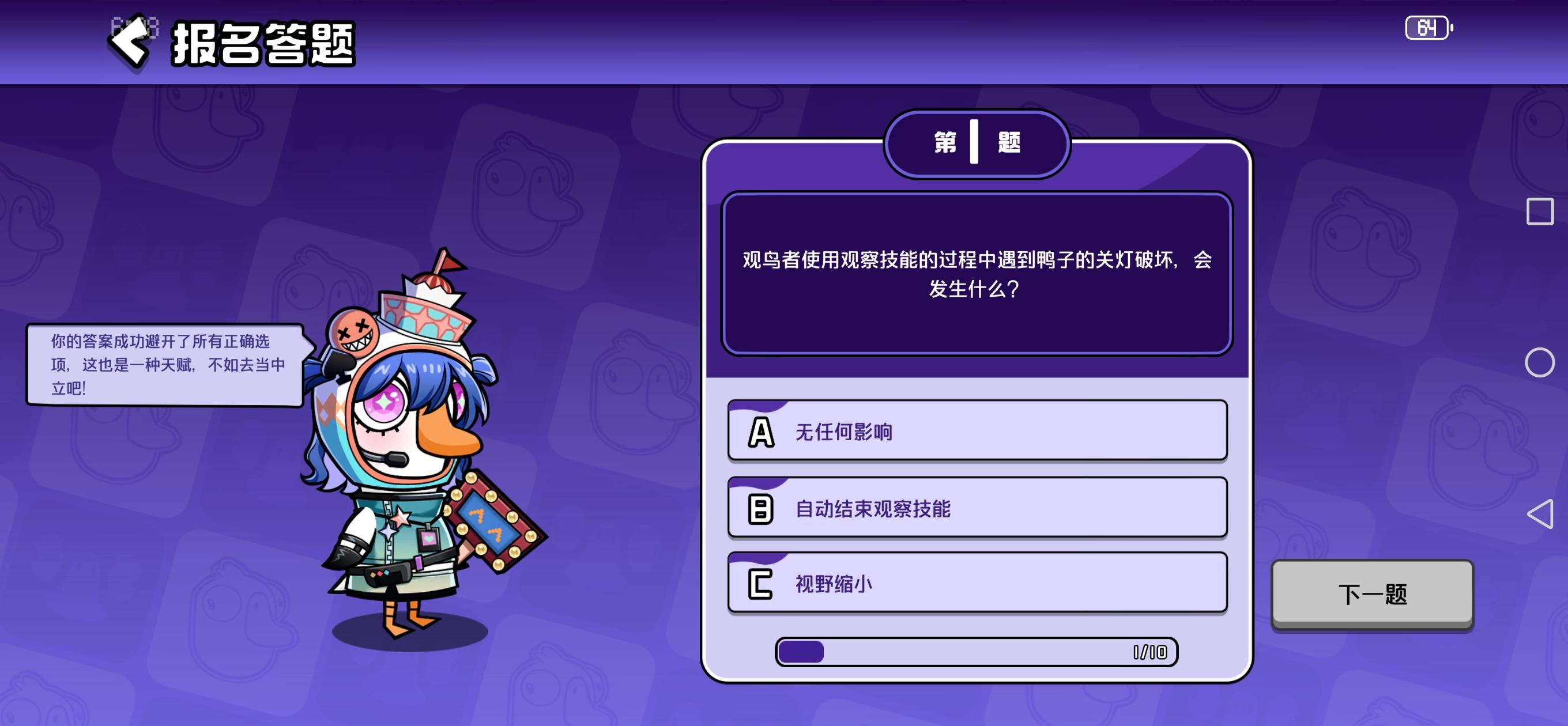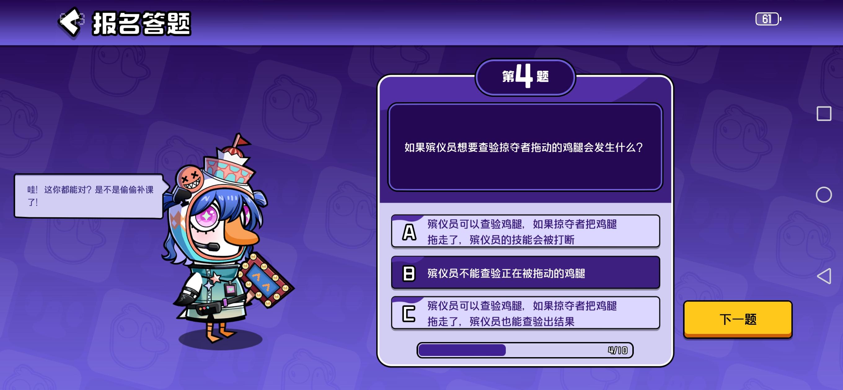 主包反复测试了鹅鸭杀的题库,附在评论区里了。(图里选的答案是我刷的时候随手选的)。希望大佬能评论下正确的答案,也希望其玩家能在评论区中补充其他题目。由衷地感谢🙏🙏🙏。然后本人发现在这个领头鹅的答题过程中,左侧的小人会根据你选择(而未提交!)的选项产生相应的对话的变化,变化时间大约为等待一分半,如图2、3和图4、5所示。(但不确定这个提示是不是正确的)#鹅鸭杀 #鹅鸭杀手游 PS:图6是我游
