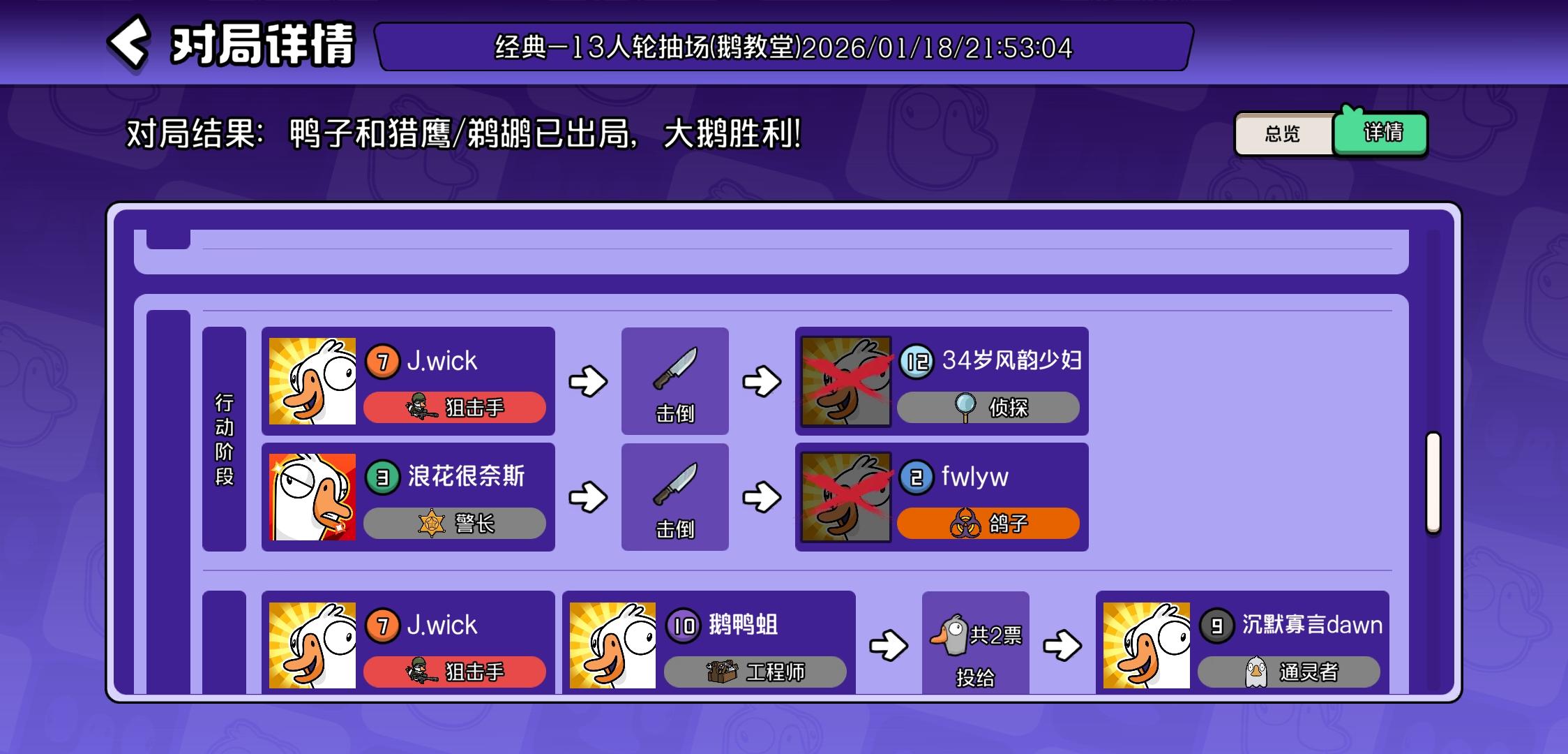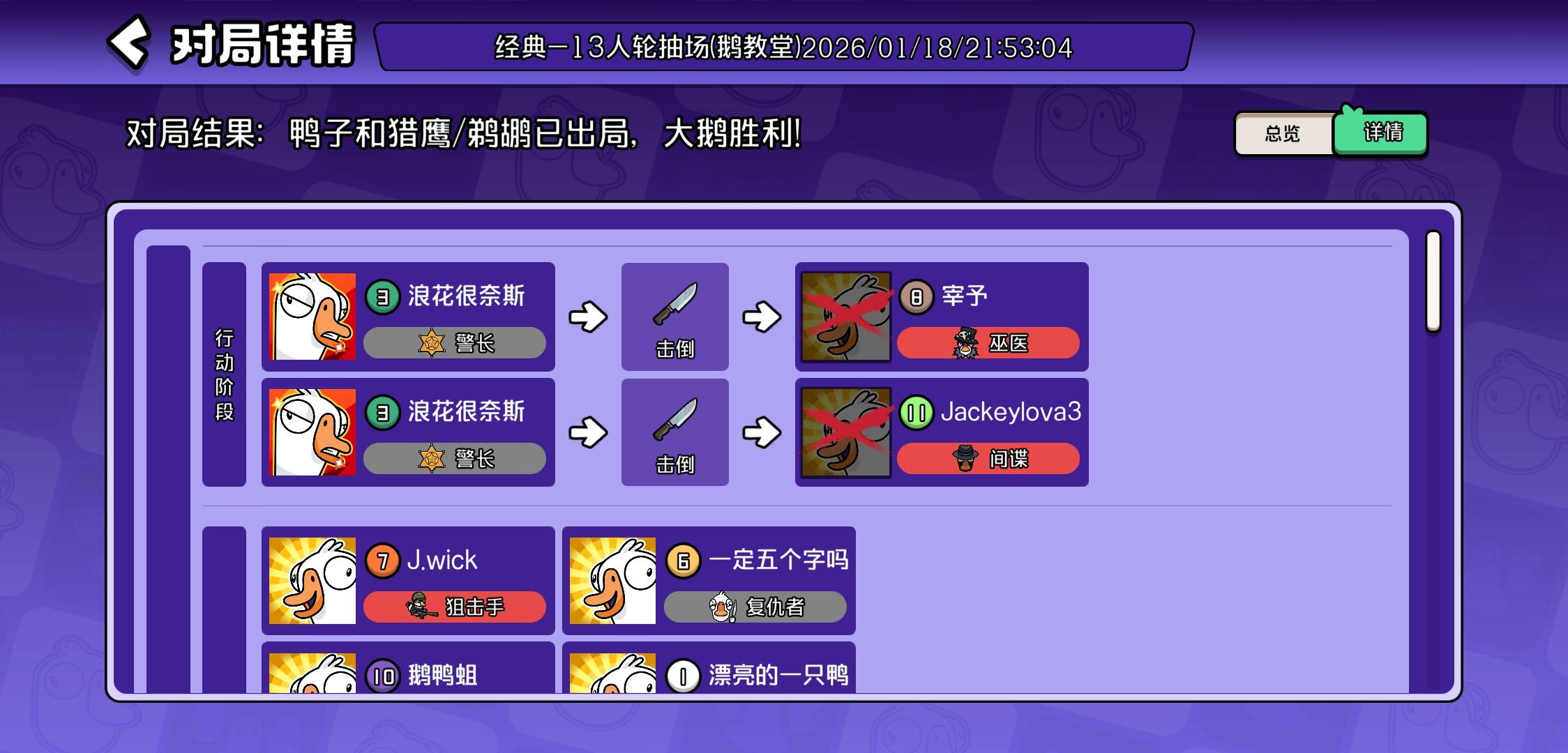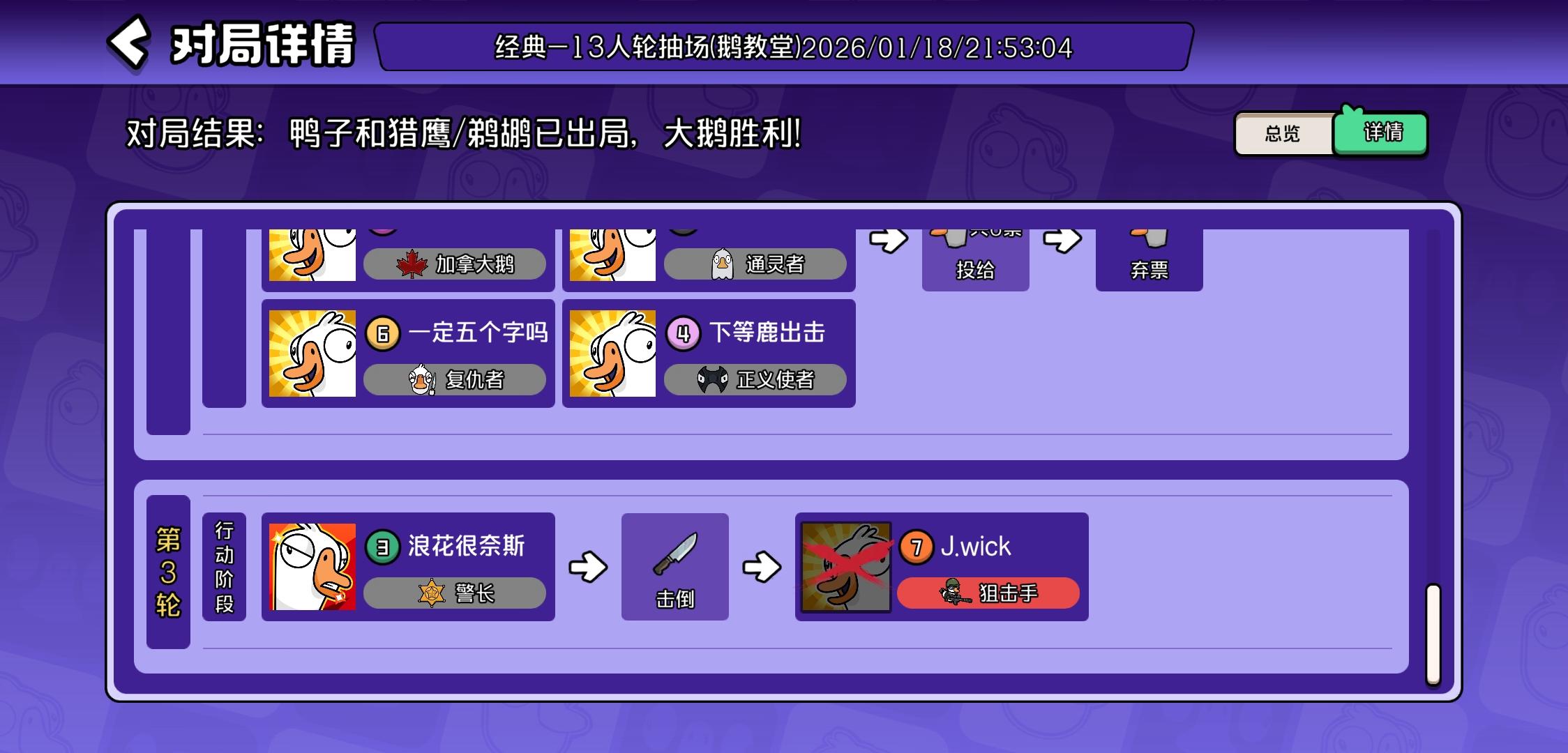 主包反复测试了鹅鸭杀的题库,附在评论区里了。(图里选的答案是我刷的时候随手选的)。希望大佬能评论下正确的答案,也希望其玩家能在评论区中补充其他题目。由衷地感谢🙏🙏🙏。然后本人发现在这个领头鹅的答题过程中,左侧的小人会根据你选择(而未提交!)的选项产生相应的对话的变化,变化时间大约为等待一分半,如图2、3和图4、5所示。(但不确定这个提示是不是正确的)#鹅鸭杀 #鹅鸭杀手游 PS:图6是我游