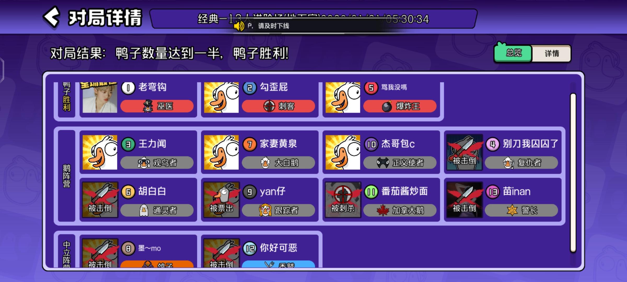 主包反复测试了鹅鸭杀的题库,附在评论区里了。(图里选的答案是我刷的时候随手选的)。希望大佬能评论下正确的答案,也希望其玩家能在评论区中补充其他题目。由衷地感谢🙏🙏🙏。然后本人发现在这个领头鹅的答题过程中,左侧的小人会根据你选择(而未提交!)的选项产生相应的对话的变化,变化时间大约为等待一分半,如图2、3和图4、5所示。(但不确定这个提示是不是正确的)#鹅鸭杀 #鹅鸭杀手游 PS:图6是我游