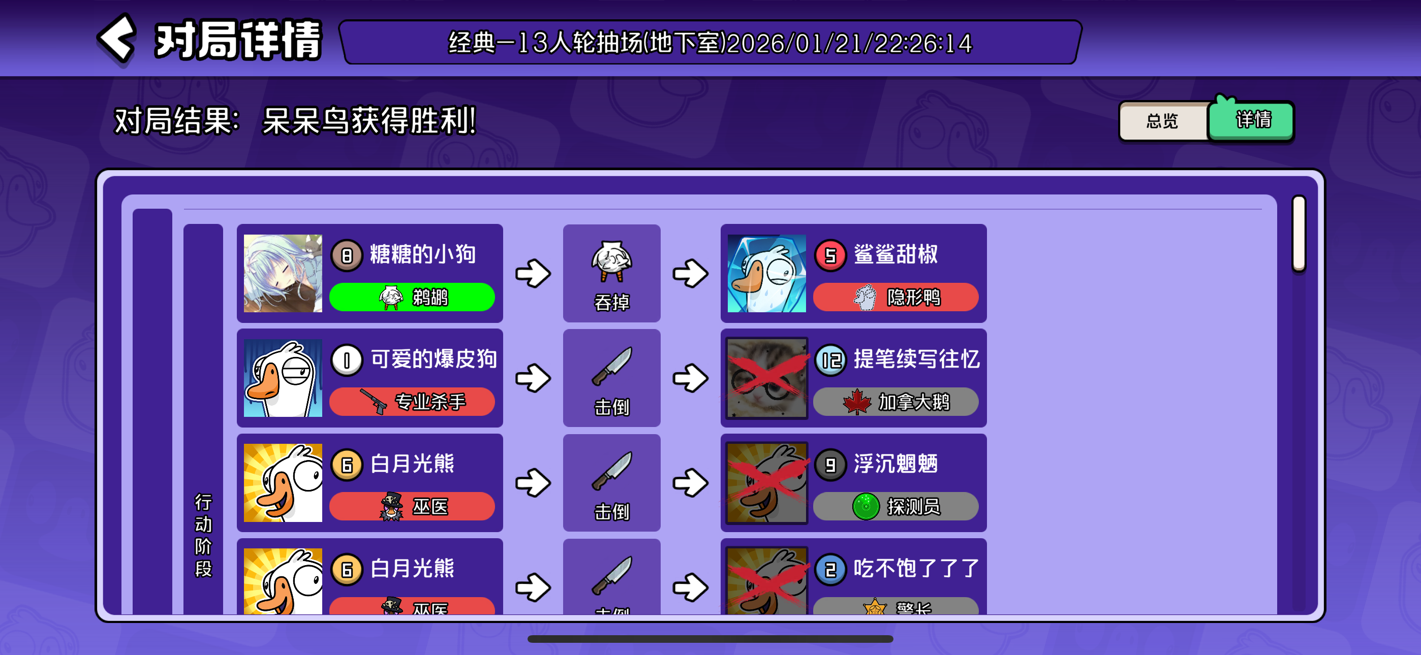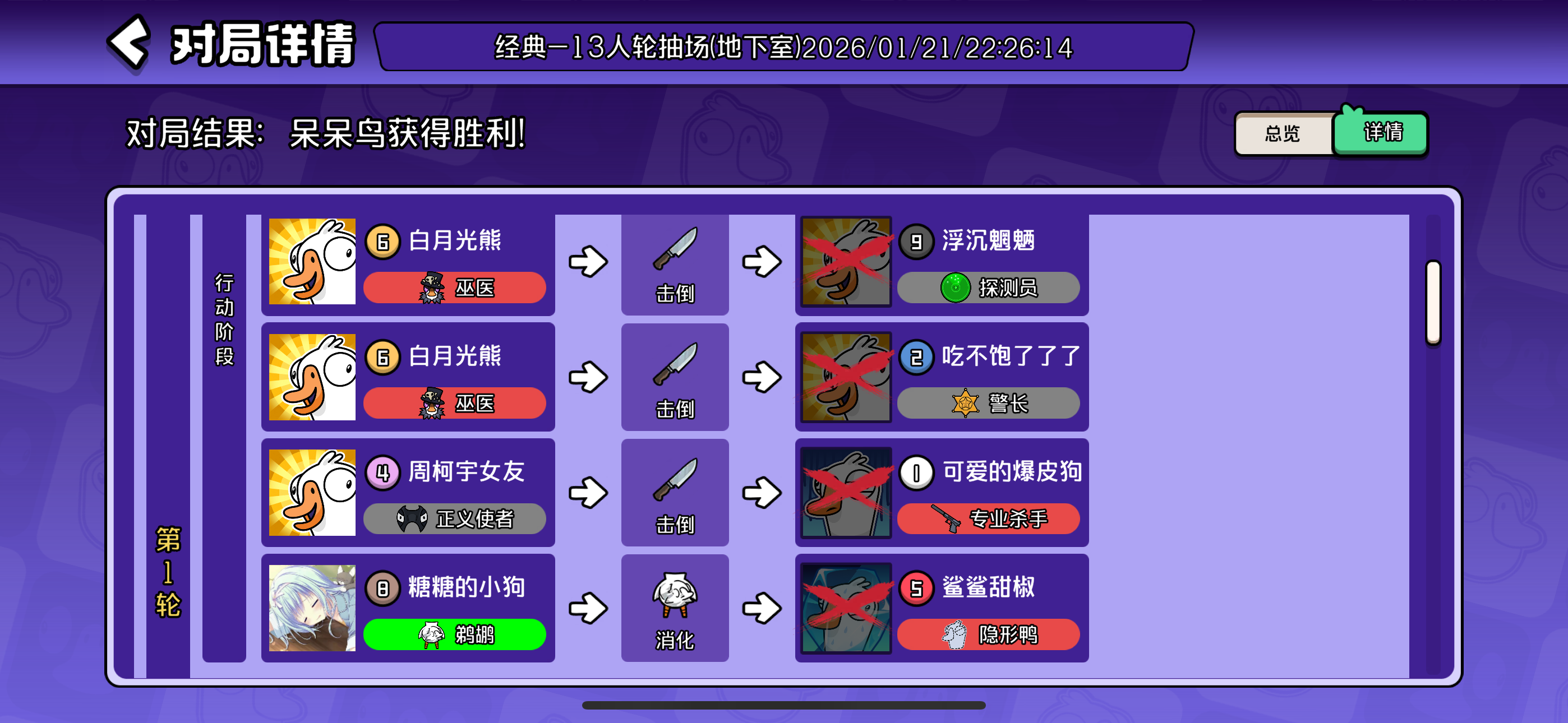 正义和隐形狼开黑,隐形被鹈鹕吃了,喊正义来救,结果正义刀错了给专杀刀了。鹈鹕报警认出,大家送呆呆赢了