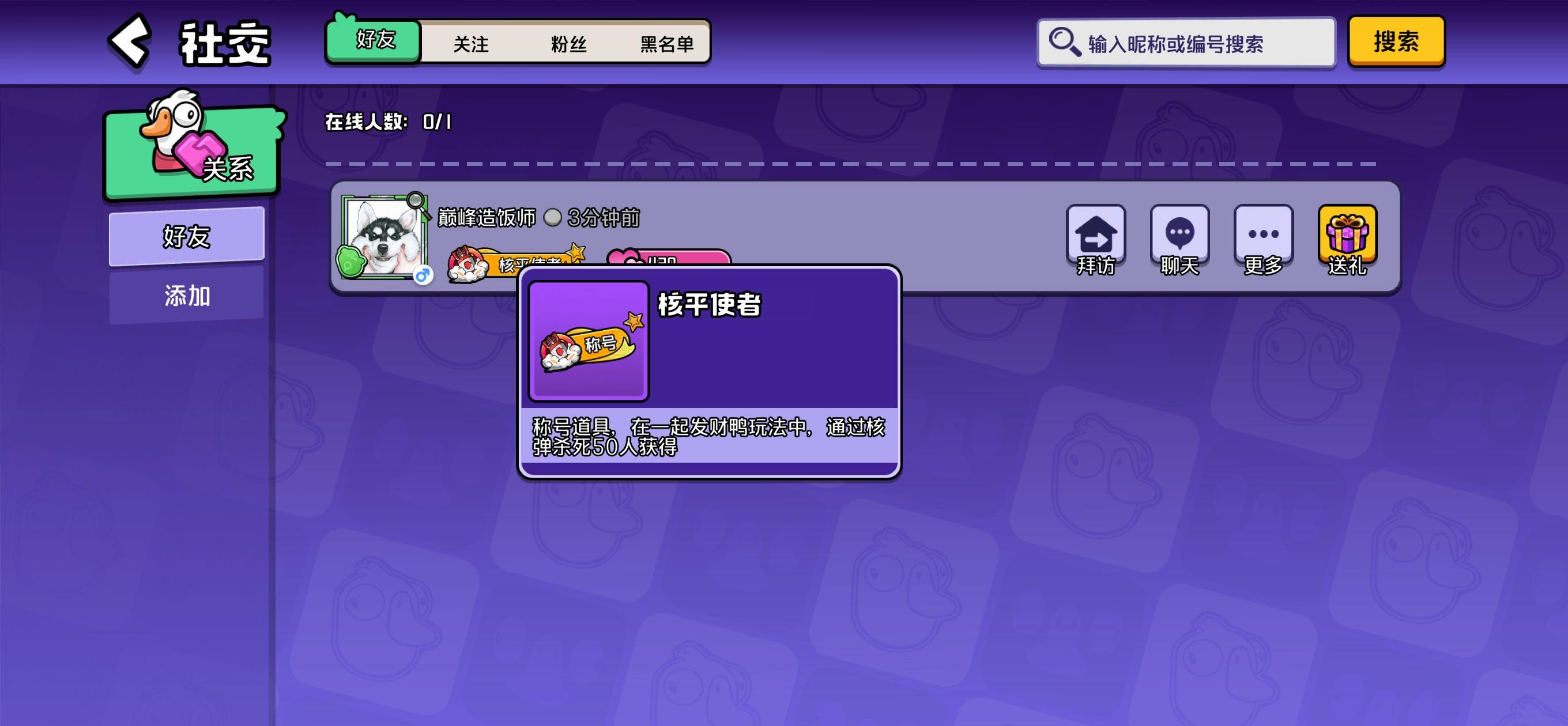 半夜十二点多打完一把发财鸭突然就解锁了。解锁之前称号面板里根本没有这个称号,解锁之后也看不见解锁条件。之后才知道用核弹累计炸掉50个人就可以获得#鹅鸭杀 #鹅鸭杀手游 #核平使者