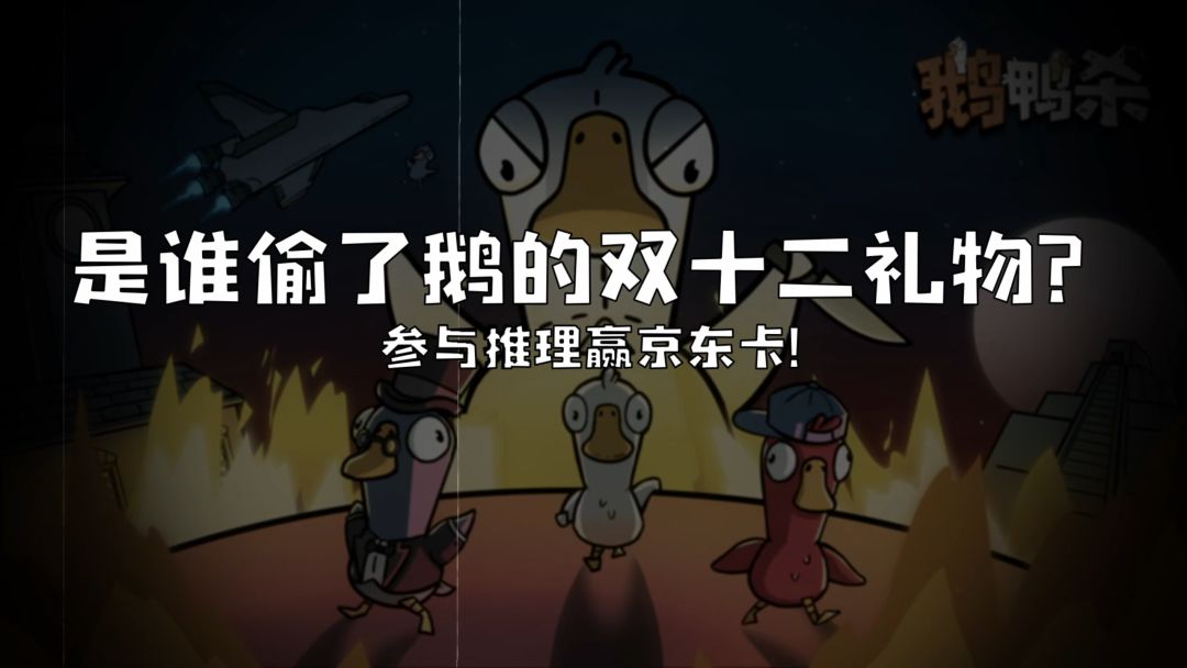 为大家准备的双十二礼物不翼而飞!各位侦探鹅,快一起找回失踪的礼物吧!——礼物失窃的背后,真相令人泪目......一同找出真正的“犯人”,赢取京东卡奖励吧!【活动时间】即日起-12月15日19:00【参与条件】关注、预约游戏并在评论区说说你猜测的犯人鹅,即有机会赢取京东卡【活动奖励】活动结束后,我们将抽取2位幸运鹅获得50元京东卡*1!【注意事项】1、请按要求认真回帖,请不要发水