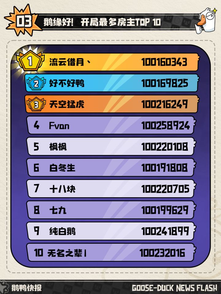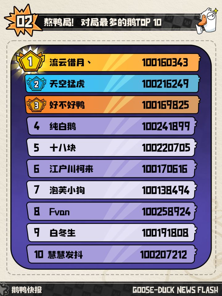官方鹅为各位幸运鹅们准备了一份评级测的数据榜单,快来看看你是不是刀人最多的那只鸭!-鹅鸭杀手游预约火热进行中σ ゚∀ ゚)σ 各位幸运鹅准备好开启新的「整活」之旅了吗? #鹅鸭杀 #鹅鸭杀手游 #发现好游戏