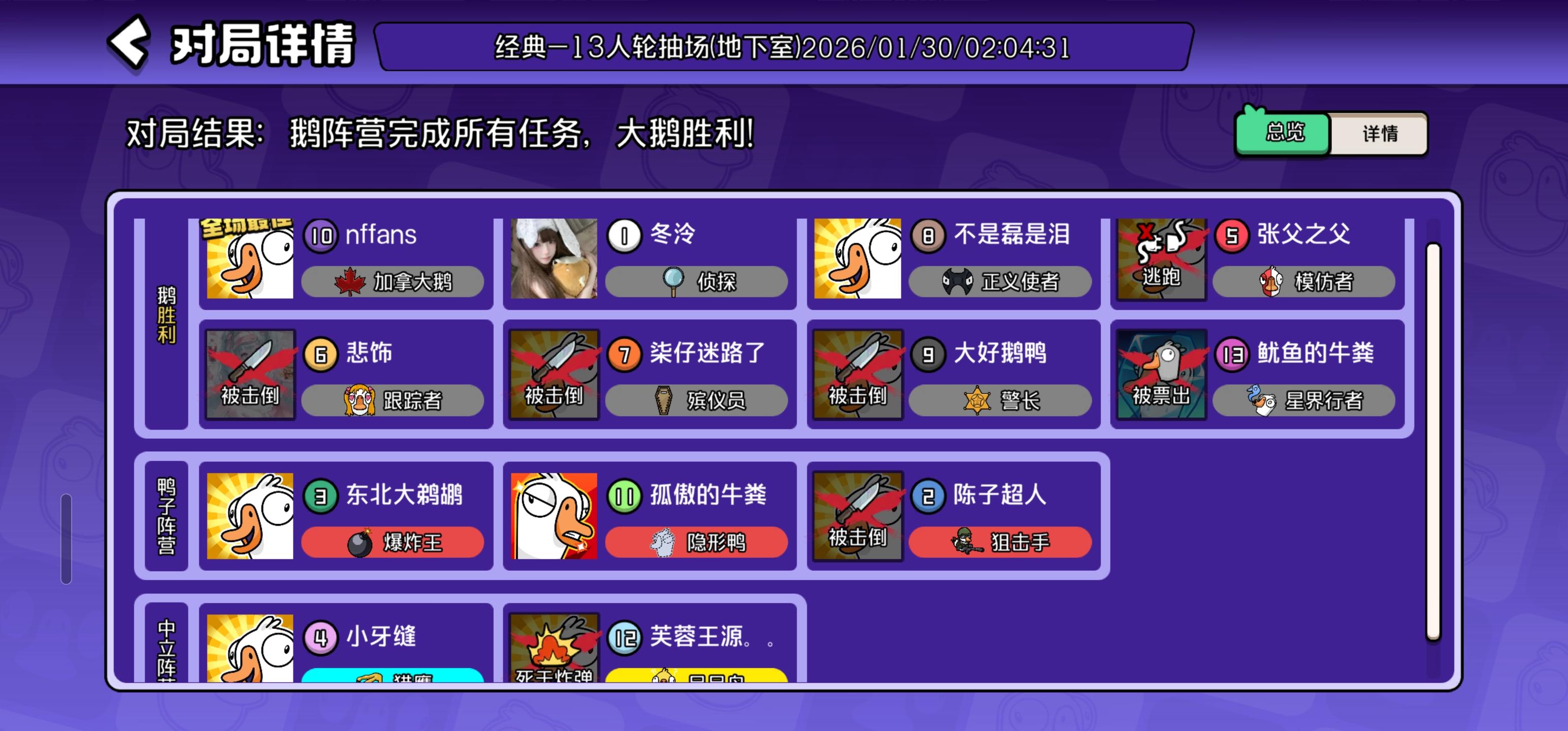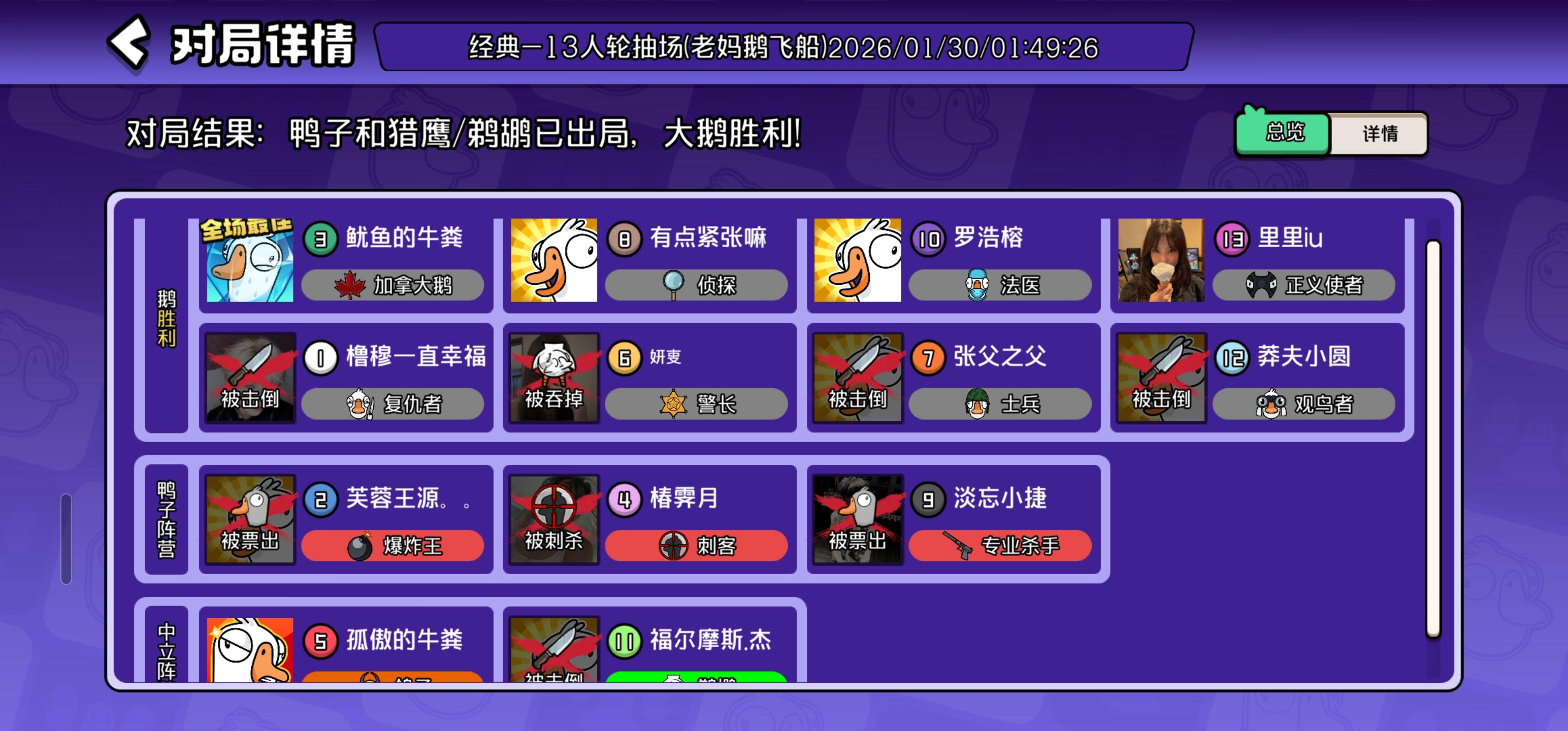 我观鸟,开局看见4,12双狼报团杀人,于是第一场会议就把这件事说了出来,告诉大家没有卧底,这两个人就是狼,直接票掉我天真的以为这局游戏会非常顺利,结果,我的好人队友突然就开始互相攻击,我都明确说了双狼面刀,就没人问一下吗?为什么突然就开始踩队友了,甚至双狼都没有狡辩,就说了一句网卡跳过,苍白无力,他们还在那里疯狂展示智商,摆出一堆证据证明队友有问题,我一直在公屏4,12,4,12,我打了一百遍,