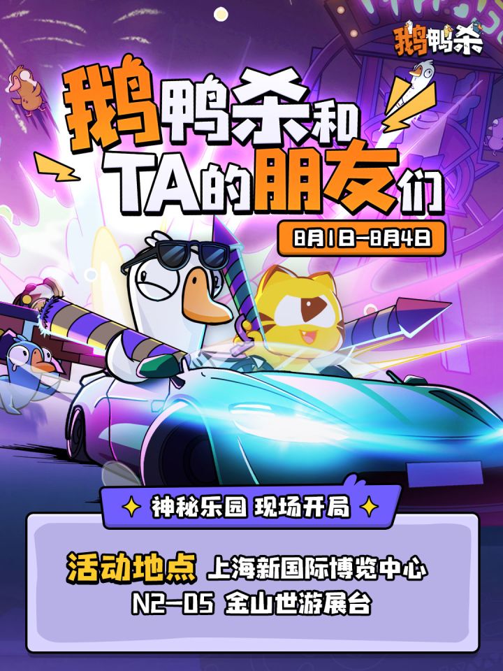 🎁 在评论区留下你的期待,7月30日抽取3位幸运鹅获得鹅鸭杀周边冰箱贴!欢迎各位幸运鹅们光临神秘乐园!在这里,你可以——√ 现场参加水友赛 大屏直播你的超绝操作!√ 沉浸式场景体验 完成任务领取神秘大礼!√ 与鹅友合影打卡 超萌大白鹅等你来贴贴!✨【参展情报】✨※ 参展时间:8月1日~8月4日※ 展位信息:上海新国际会展中心 N2-05↓ 请收好这份活动指引 ↓鹅鸭