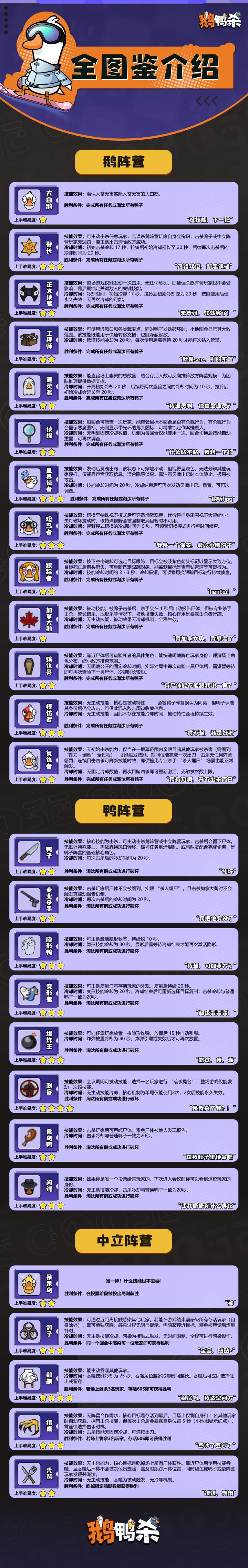 【新手必看】《鹅鸭杀》从零上手全攻略:角色 /地图/ 模式 / 发言全概括!哈喽,各位刚入坑的幸运鹅 & 潜伏的鸭子们!初次加入乐园,面对陌生的职业和地图,是不是有点迷茫?不知道选什么身份、哪种模式适合新手、遇到刺客 / 警长该怎么应对?这篇超全攻略把「角色图鉴 + 地图详解 + 模式玩法」打包奉上,萌新快码住,老玩家也来凑个热闹叭ヾ(●´∀`●) 一、超详细长图攻略一图流自取感谢 @鹅