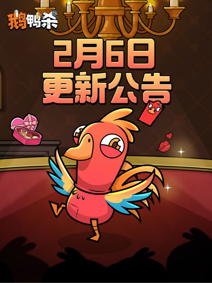 亲爱的幸运鹅:服务器将于2月6日7:00-11:00停服维护。具体维护时间视实际情况提前或顺延,请大家提前做好下线准备。【全新原创角色】国服限时角色——锦鸡上线!发红包!发红包!发红包!我要发红包!让我赢!【赛季系统上线】• S1赛季-锦羽迎春开启• 全新传说及史诗卡池:新年穿新衣,马年要来到~• S1赛季通行证:谁的头上长了花?什么花?烟花!• 推理等级系统:身份全靠猜,逻辑全靠