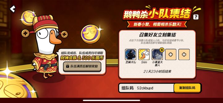 我的组队码:ek0tcasz。新年小聚别瞎逛!和家人朋友玩一局鹅鸭杀,相爱相杀迎财神,限定皮肤一起拿