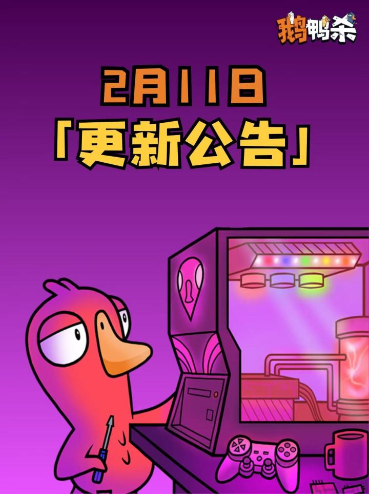 亲爱的幸运鹅: 服务器将于2月11日7:00-12:00停服维护,具体维护时间视实际情况提前或顺延,请大家提前做好下线准备。【更新内容】 -开启春节抽奖活动 -修复部分已知的BUG#鹅鸭杀 #鹅鸭杀手游