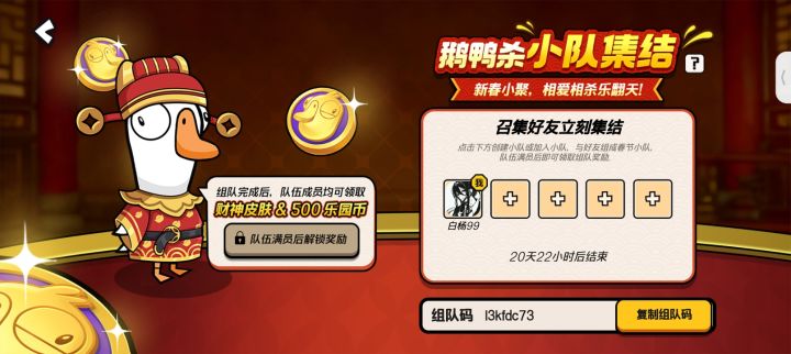 我的组队码:3i3mkzlk。新年小聚别瞎逛!和家人朋友玩一局鹅鸭杀,相爱相杀迎财神,限定皮肤一起拿