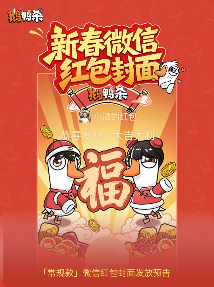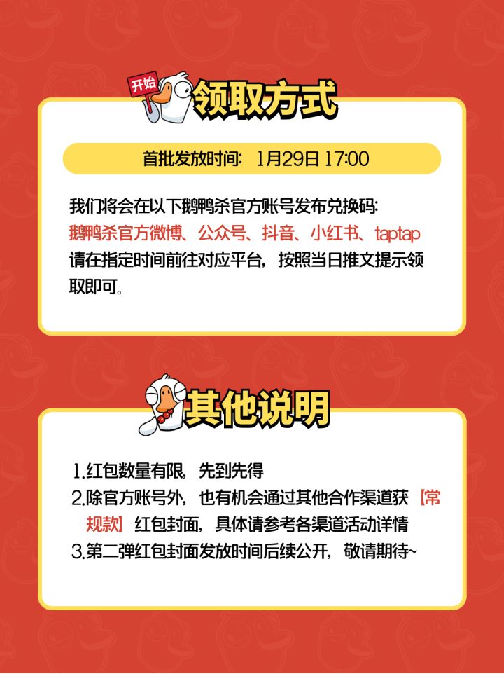 官方鹅给大家发红包封面了~2026新春红包封面限量发放即将开启!• 领取方式: 首批发放时间:1月29日17:00 我们将会在以下鹅鸭杀官方账号发布兑换码:鹅鸭杀官方微博、公众号、抖音、小红书、taptap请在指定时间前往对应平台,按照当日推文提示领取即可。• 其他说明: 1.红包数量有限,先到先得 2.除官方账号外,也有机会通过其他合作渠道获【常规款】红包封面,具体请参考各渠道活动详