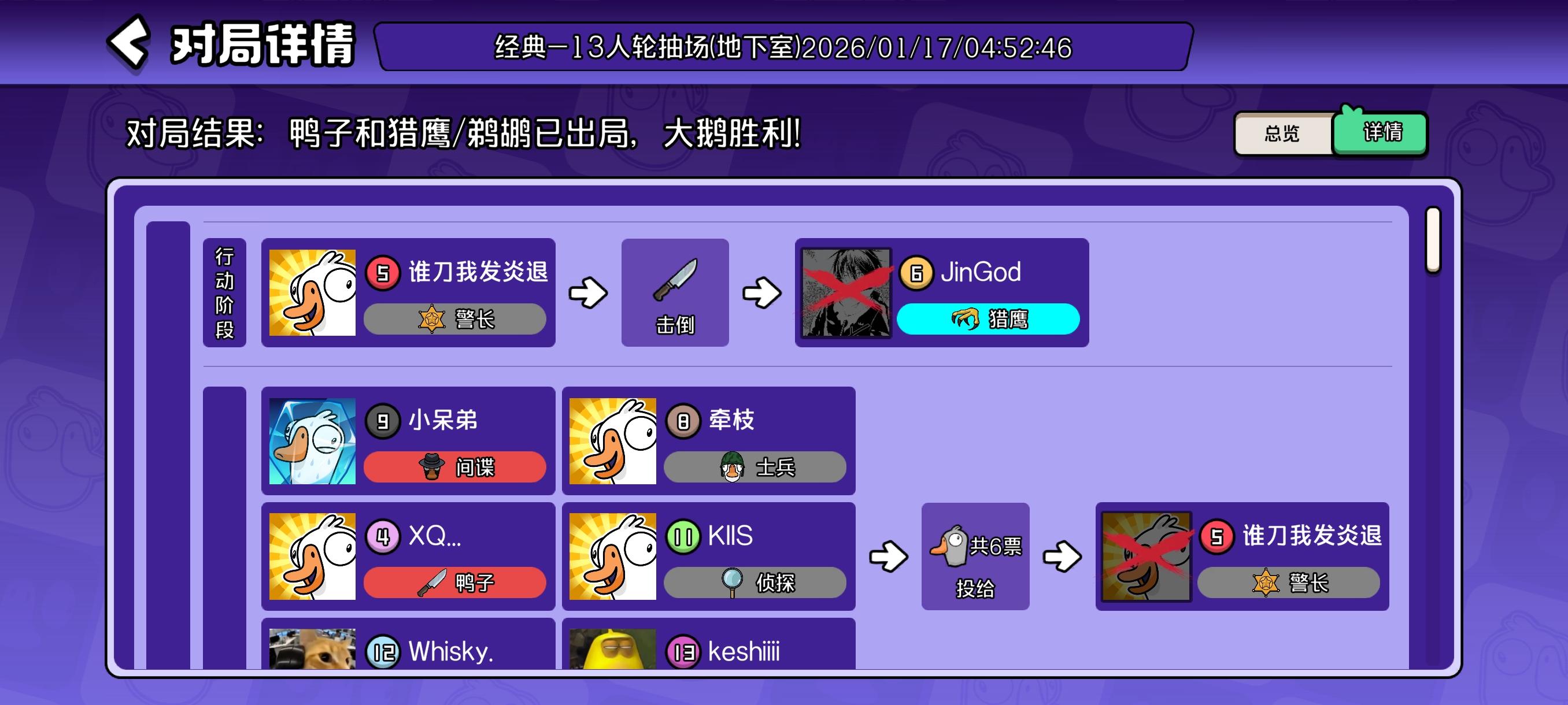 主包反复测试了鹅鸭杀的题库,附在评论区里了。(图里选的答案是我刷的时候随手选的)。希望大佬能评论下正确的答案,也希望其玩家能在评论区中补充其他题目。由衷地感谢🙏🙏🙏。然后本人发现在这个领头鹅的答题过程中,左侧的小人会根据你选择(而未提交!)的选项产生相应的对话的变化,变化时间大约为等待一分半,如图2、3和图4、5所示。(但不确定这个提示是不是正确的)#鹅鸭杀 #鹅鸭杀手游 PS:图6是我游