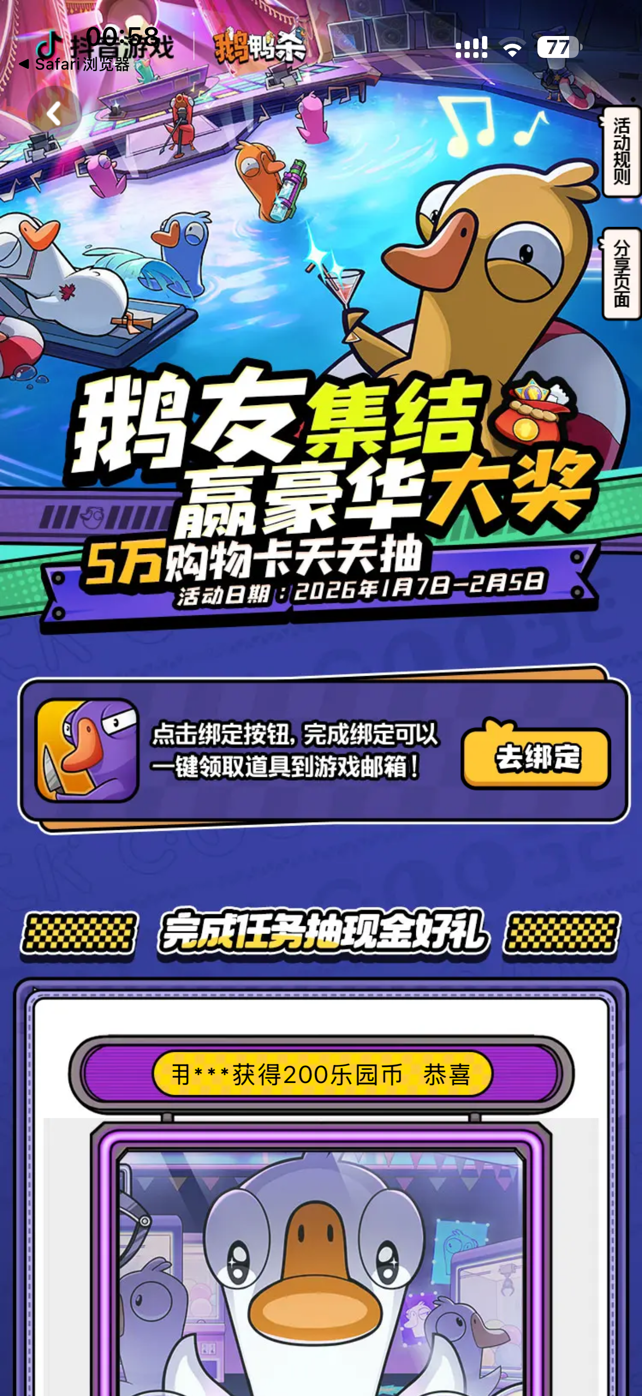 各位幸运鹅:对不起,尽管技术鹅们已经在拼命扩容中,但解决仍需一点时间,今天还是出现了排队问题。说到做到,今日的排队补偿已经备好,明天上午12:00后登录即可领取一份用心精选【皮肤自选礼包】。ps.此礼包可以玩家直接使用,也可赠送满足一定亲密度数值的好友。感谢大家的耐心等待。《鹅鸭杀》运营团队2026年1月9日#鹅鸭杀 #鹅鸭杀手游 #鹅鸭杀公测 #