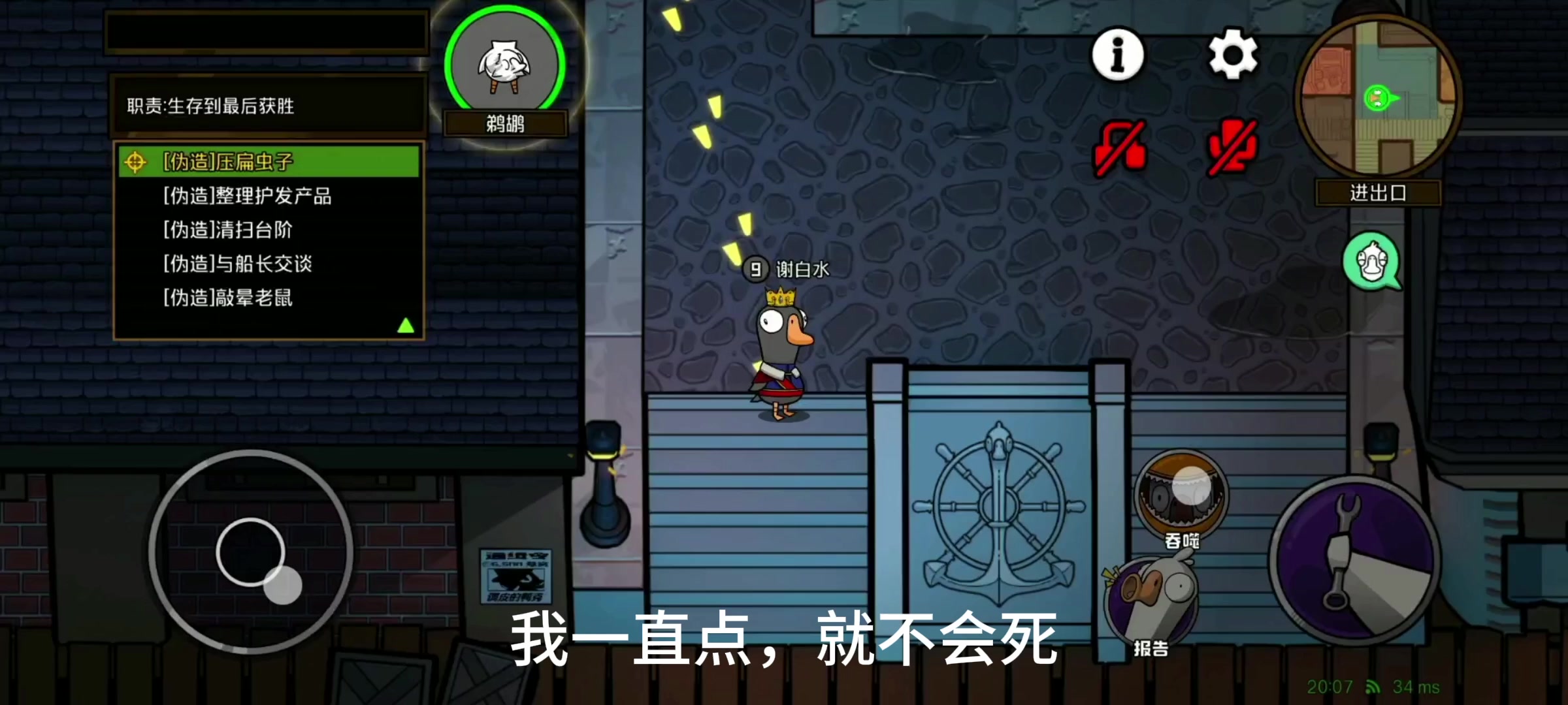 主包反复测试了鹅鸭杀的题库,附在评论区里了。(图里选的答案是我刷的时候随手选的)。希望大佬能评论下正确的答案,也希望其玩家能在评论区中补充其他题目。由衷地感谢🙏🙏🙏。然后本人发现在这个领头鹅的答题过程中,左侧的小人会根据你选择(而未提交!)的选项产生相应的对话的变化,变化时间大约为等待一分半,如图2、3和图4、5所示。(但不确定这个提示是不是正确的)#鹅鸭杀 #鹅鸭杀手游 PS:图6是我游