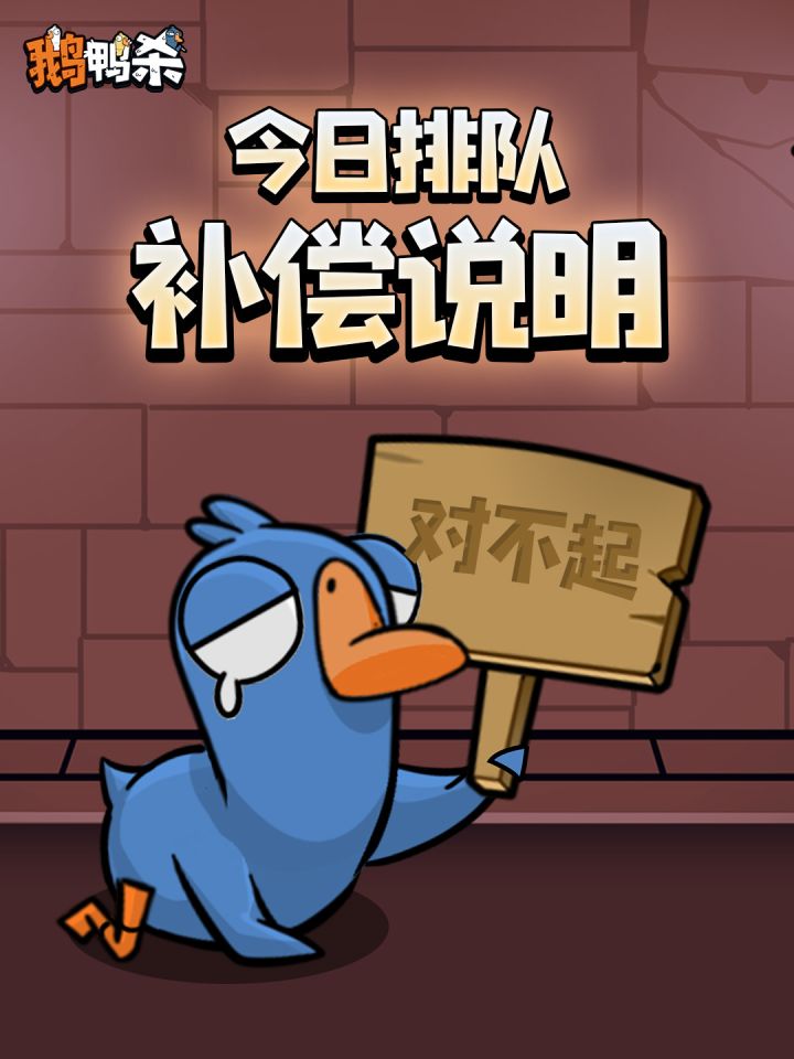 各位幸运鹅:对不起,尽管技术鹅们已经在拼命扩容中,但解决仍需一点时间,今天还是出现了排队问题。说到做到,今日的排队补偿已经备好,明天上午12:00后登录即可领取一份用心精选【皮肤自选礼包】。ps.此礼包可以玩家直接使用,也可赠送满足一定亲密度数值的好友。感谢大家的耐心等待。《鹅鸭杀》运营团队2026年1月9日#鹅鸭杀 #鹅鸭杀手游 #鹅鸭杀公测 #