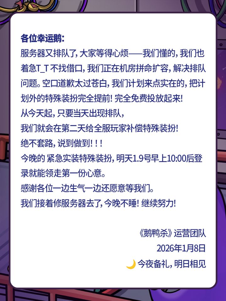 各位幸运鹅:服务器又排队了,大家等得心烦——我们懂的,我们也着急T_T不找借口,我们正在机房拼命扩容,解决排队问题。空口道歉太过苍白,我们计划来点实在的,把计划外的特殊装扮完全提前!完全免费投放起来!从今天起,只要当天出现排队,我们就会在第二天给全服玩家补偿特殊装扮!绝不套路,说到做到!!!今晚的 紧急实装特殊装扮,明天1月9日早上10:00后登录就能领走第一份心意。感谢各位一边生