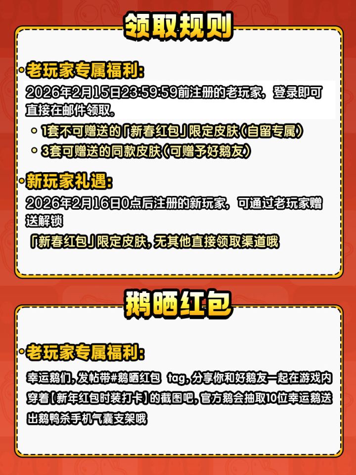 邀友同玩,赠衣同庆——春节小聚玩鹅鸭杀,老带新好礼人人有份,鹅管够!🧧 活动规则• 老玩家专属福利:2026年2月15日0点前注册的所有老玩家,登录人人都能领,一套不少、全员都有!◦ 1套「新春红包」限定皮肤(自留专属,不可赠送)◦ 3套同款皮肤(可大方送给好鹅友)皮肤管够,老鹅友人手一份,绝不落空~• 新玩家礼遇:2026年2月15日0点后注册的新玩家,通过老玩家赠送解锁「新春红