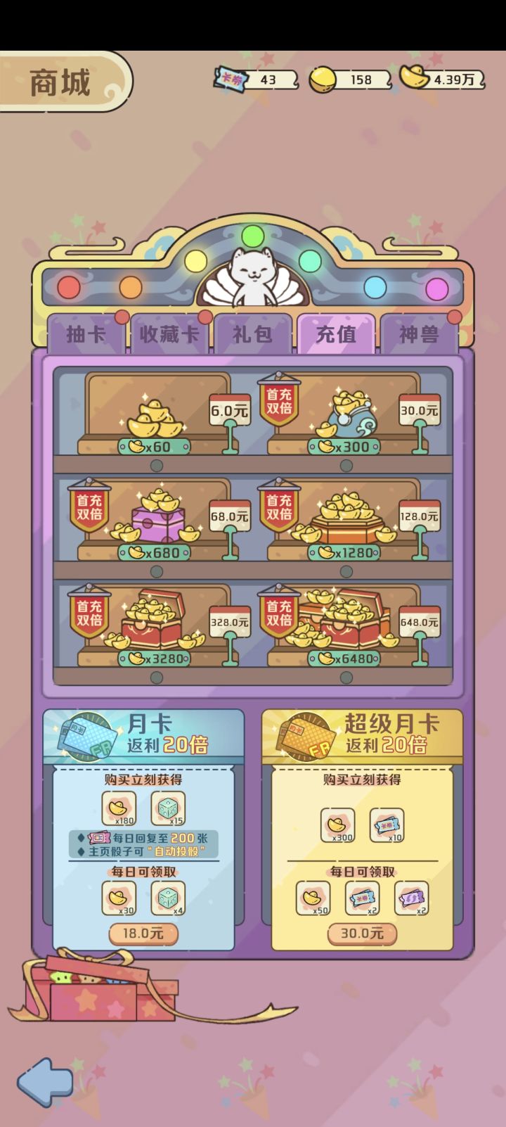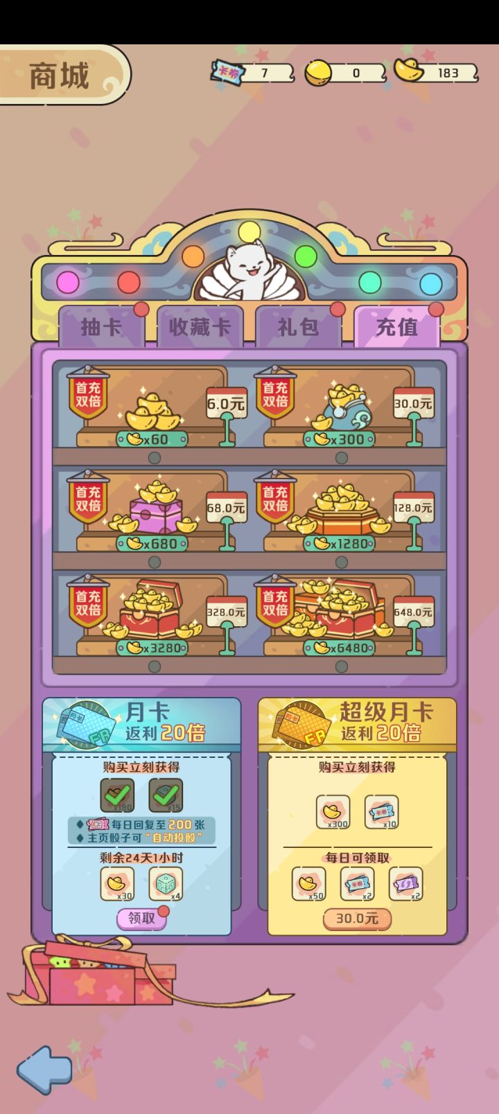 微氪:推荐(原因:很多时候月卡多的那一个自动投骰子和广告票可以增强你的游戏体验)