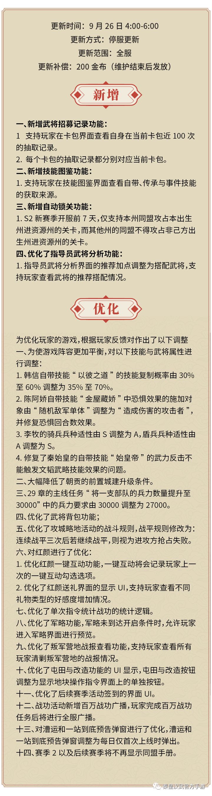 【秦皇汉武】9月26日版本更新公告
