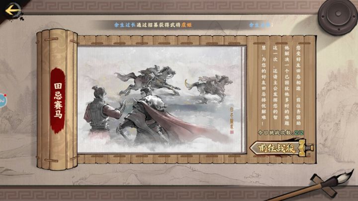 不知不觉已经过去了几个月,相信主公大人们已经迫不及待想要试玩了吧。距离公测还有近10天这个节点上,小迷弟将新玩法偷偷送上爆料!看看公测版本会带来什么崭新的玩法吧~在战役中,主公们将扮演历史角色参与名役,通过在一道道关卡中决策,感受以弱胜强、运筹帷幄的策略魅力。成语出自:西汉·司马迁《史记・孙子吴起列传》孙武既死,后百余岁有孙膑。膑生阿、鄄之间,膑亦孙武之后世子孙也。孙膑尝与庞涓俱学兵法。庞涓既