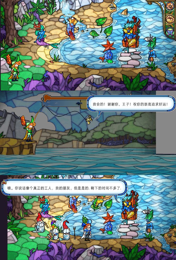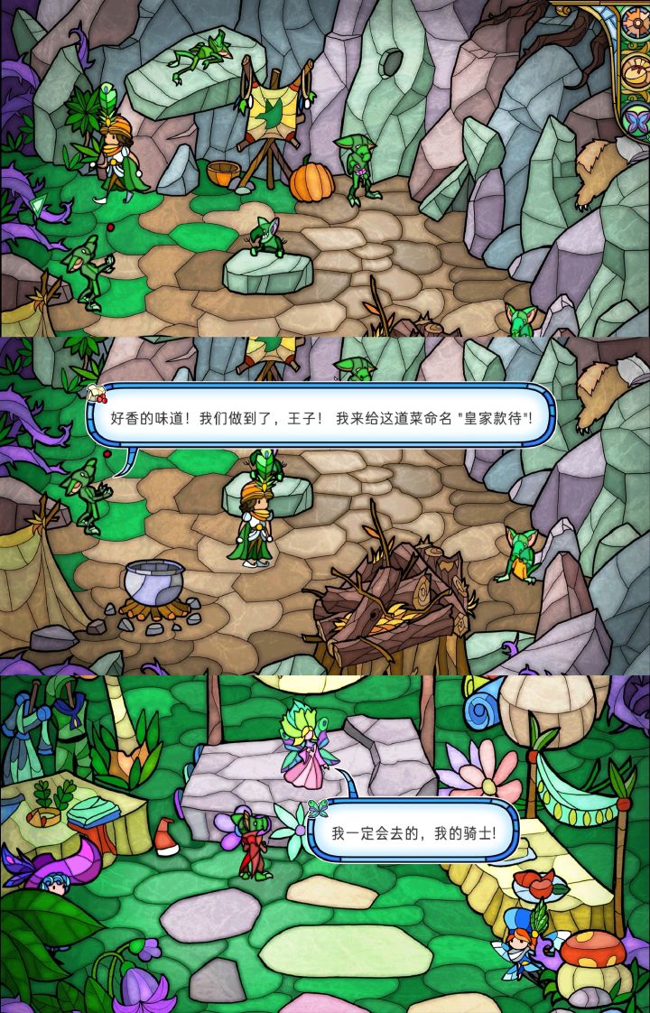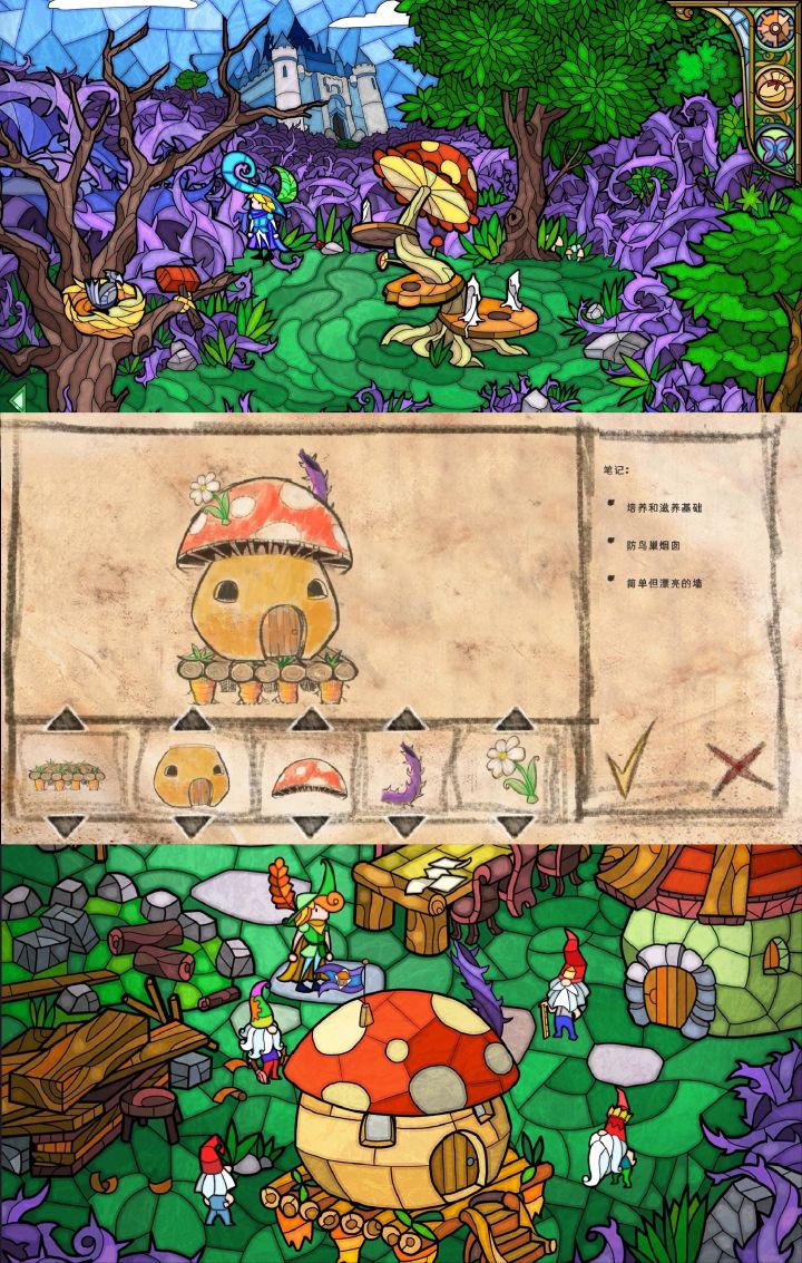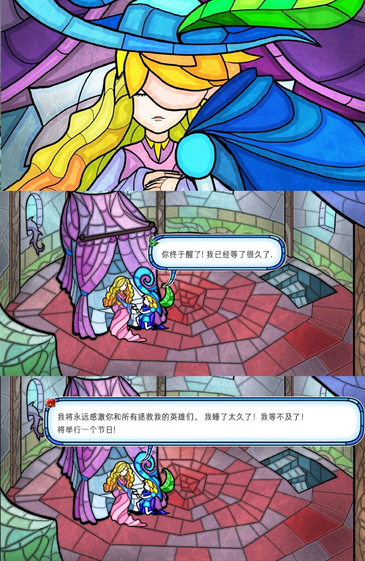 终于通关了,看着简单的游戏,难度可一点不小啊。这个游戏画风一下子就能让人想到教堂里的那种五颜六色拼在一起的玻璃,鲜艳亮丽,惊奇有趣。游戏剧情以格林童话《睡美人》为背景,玩家要以王子的身份出发,到魔法森林探险,得到侏儒、人鱼、仙女、小鬼的愿望,激活蘑菇迷宫,打开通往城堡的路,到宫殿里亲吻公主,唤醒她,破除诅咒。要获得他们的愿望,需要做到:①帮侏儒盖房子;②请侏儒帮忙给人鱼建大坝(钻石、鱼牙、三叉