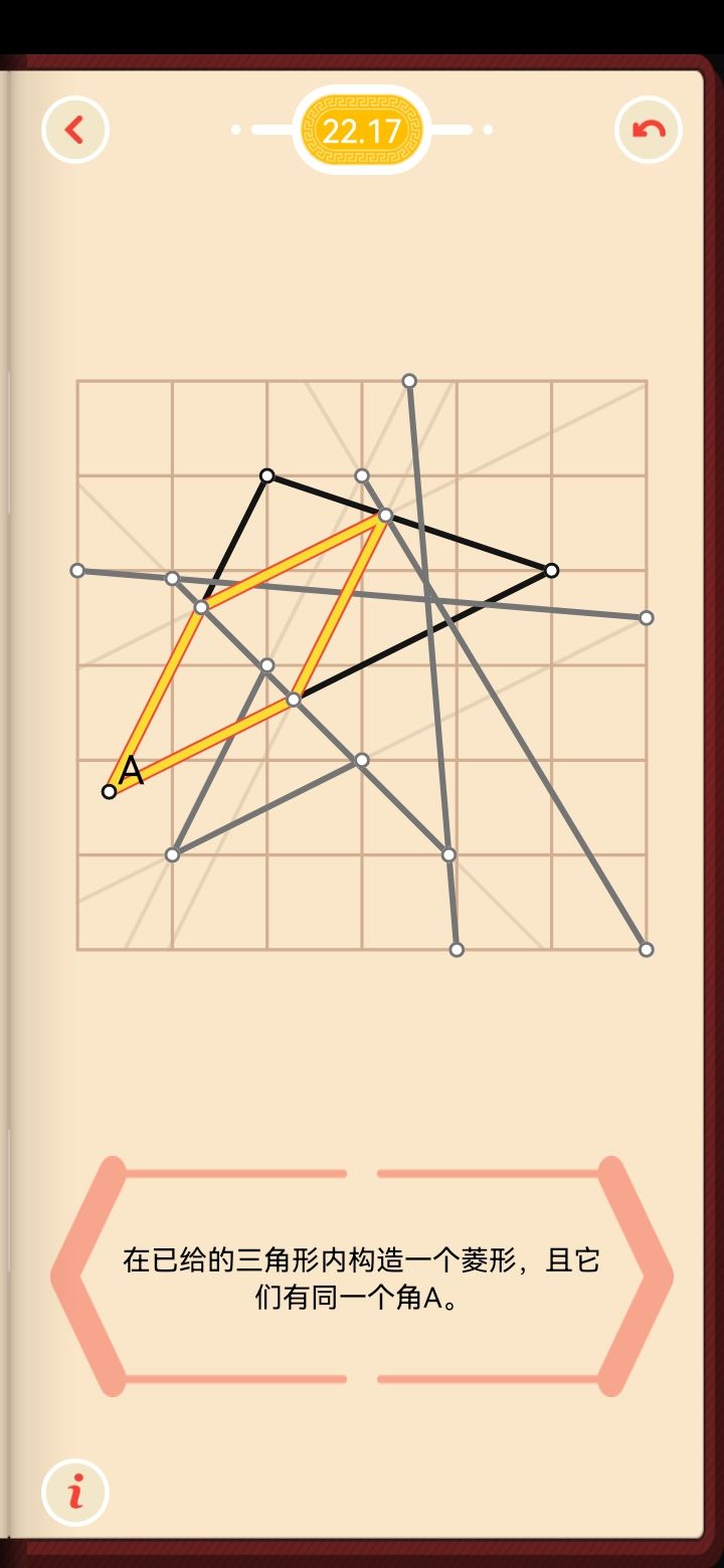最近刚玩这款游戏,刚做到2.16,发现这一题至少有七种不同的方法,想问一下大家都用的什么方法?如图,有七个平行线上的点是通过一条辅助线就能找到的。