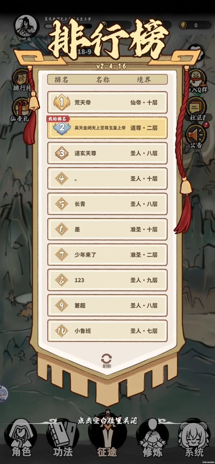 今天看了很久论坛,发现覆盖面广的当前版本攻略很少,那么我来总结一下主流玩法和一些技巧。因为追求全面,所以很多内容熟手都知道,可以选择跳着使用。本攻略适合所有阶段玩家使用,攻略把所有达到不同修为玩家进行了分级。新手级---准圣及以下新手由于刚入门,我会对游戏机制进行一个较为清晰的解释。天赋&修炼:由于强度问题,推荐使用的天赋只有“荒古圣体”“混沌道体”“先天剑体”“狂雷战体”“龙神血脉”“