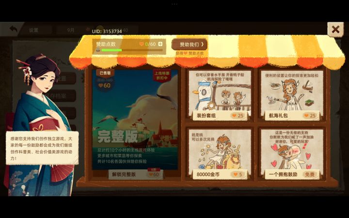 游戏性和剧情都无可挑剔,每一个NPC人设都很饱满,能感觉到文案和美术的用心,6元的价格实属小精品。非要说缺点的话,航海不能快进比较烦,加上评论区都在说的一直卡顿(换了三个设备,平板和手机都卡)需要不断退出重进。但是感觉可能游戏卖得不是很好吧官方好像也没有在运营了😂mussy game这个工作室出的游戏真的都挺不错的
