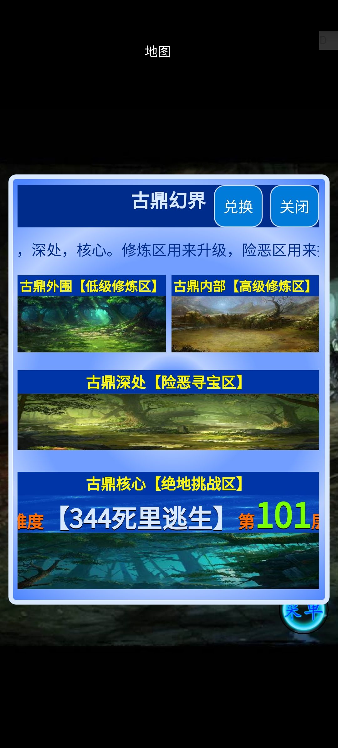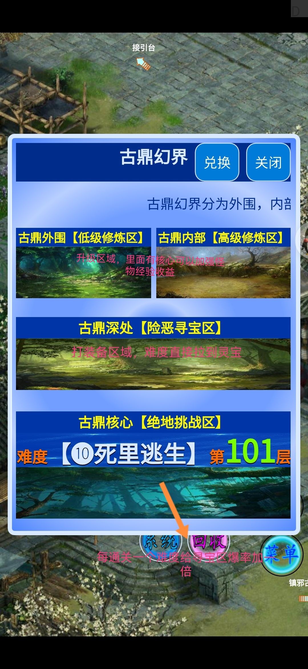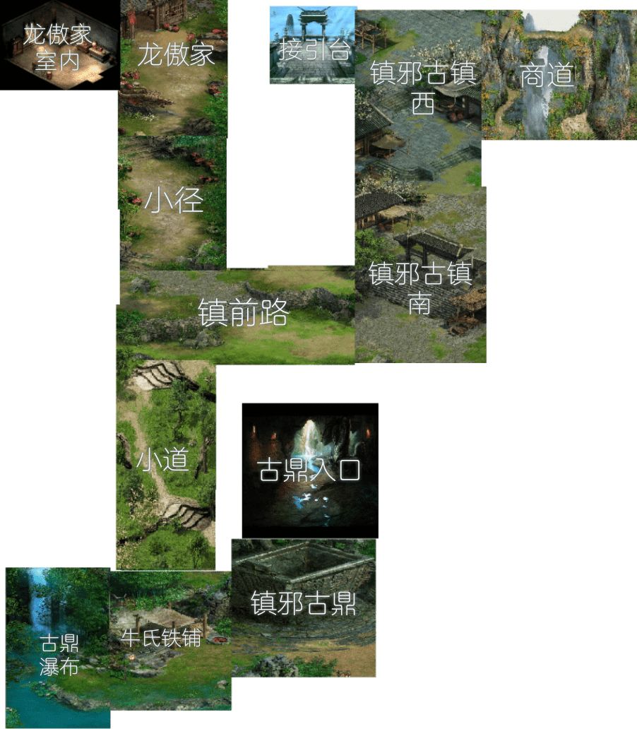 游戏简单地图 小径:npc:龙傲,可以购买一些物品 镇邪古镇南:神秘小贩有一个简单的任务 镇邪古镇西:商道接引人可以接取跑商任务 商道:跑商小玩法 接引台:50年道行并且在商店购买先天丹突破后,在这里加入势力。 牛氏铁铺:人物技能最好掉落最佳地图 古鼎瀑布:钓鱼小玩法 镇邪古鼎:目前主要地图,练级打装备等