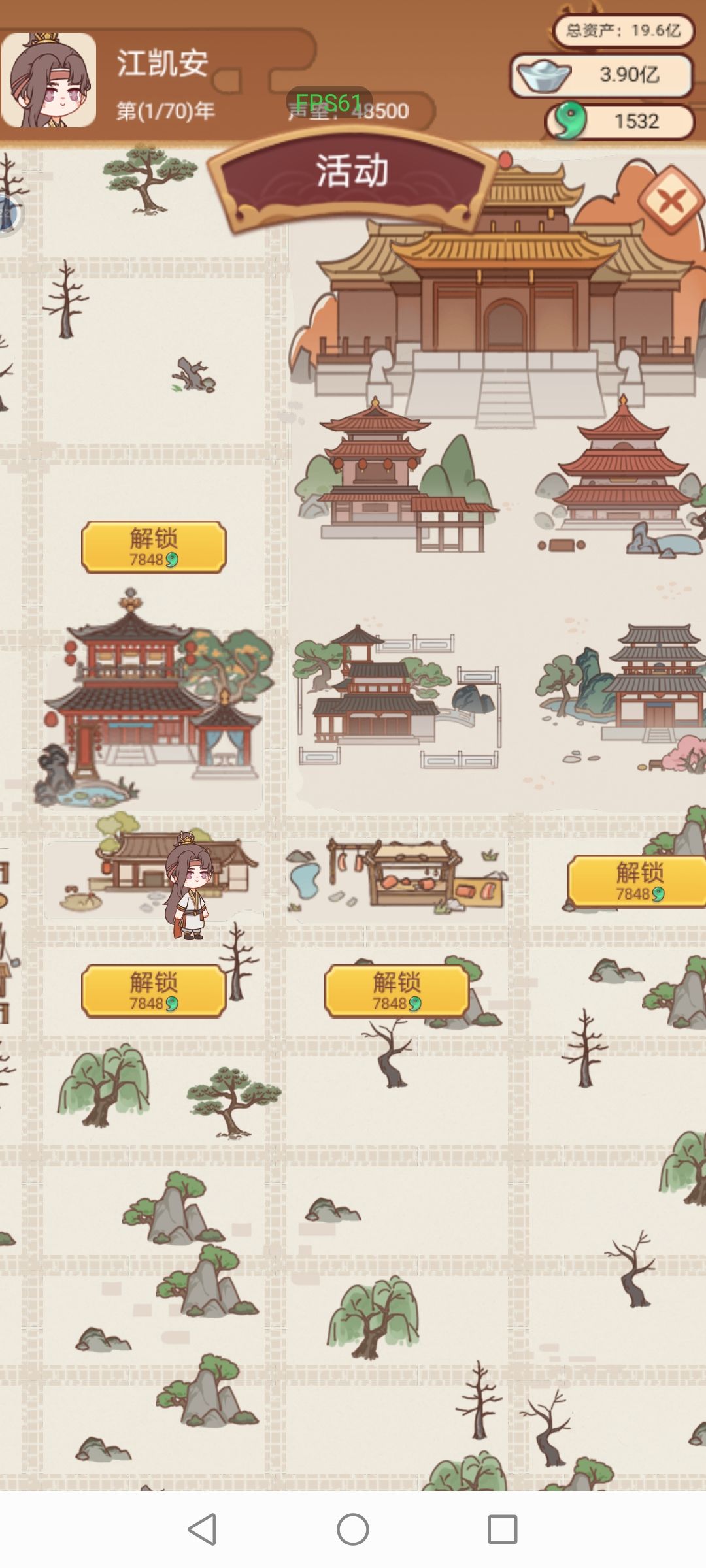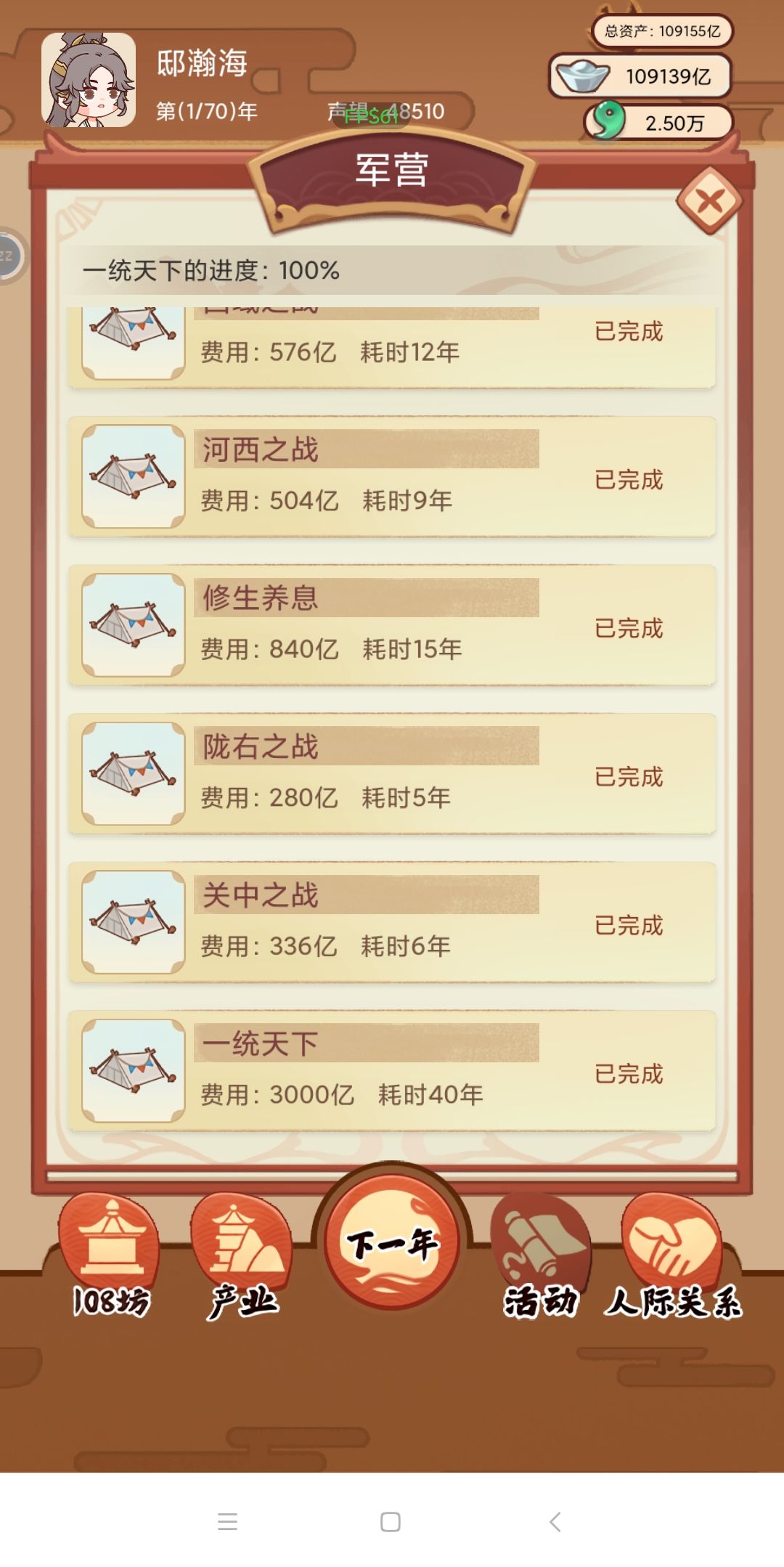简单做一个小攻略。 新手进去先囤字画,字画会涨到五十多万,如果没涨一直下一年,一直等到为止。反复几次后就可以有开马场的钱了。五千万直接开,然后一直买马,推荐蓝色及以上的马(橙色最佳)。有了马以后去比赛,推荐有五个以上橙色再去比赛。比赛完身价会暴涨,尤其是决赛胜利的橙色马,会涨到几亿到十几亿不等。这里注意了,如果已经赚了几亿了(和开局相比),果断快速结束拿勾玉。在天赋里点满“天赋异禀”。有就升级,最