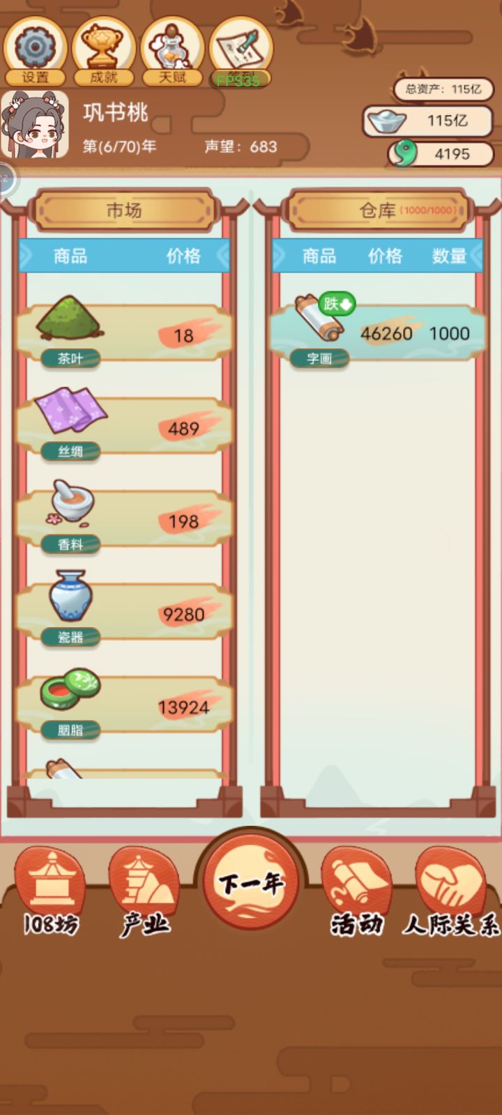 简单做一个小攻略。新手进去先囤字画,字画会涨到五十多万,如果没涨一直下一年,一直等到为止。反复几次后就可以有开马场的钱了。五千万直接开,然后一直买马,推荐蓝色及以上的马(橙色最佳)。有了马以后去比赛,推荐有五个以上橙色再去比赛。比赛完身价会暴涨,尤其是决赛胜利的橙色马,会涨到几亿到十几亿不等。这里注意了,如果已经赚了几亿了(和开局相比),果断快速结束拿勾玉。在天赋里点满“天赋异禀”。有就升级,最