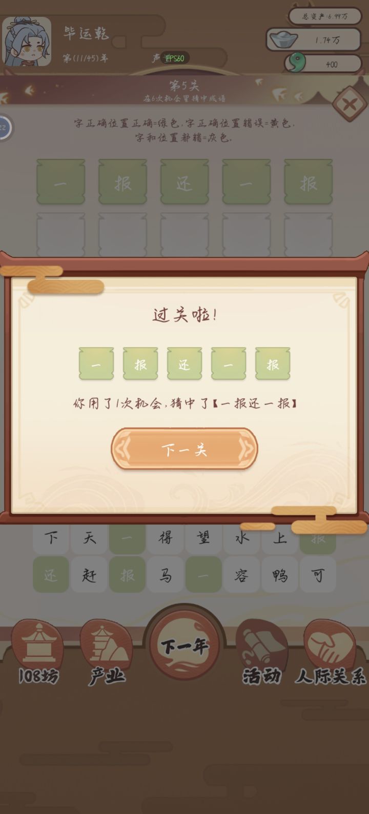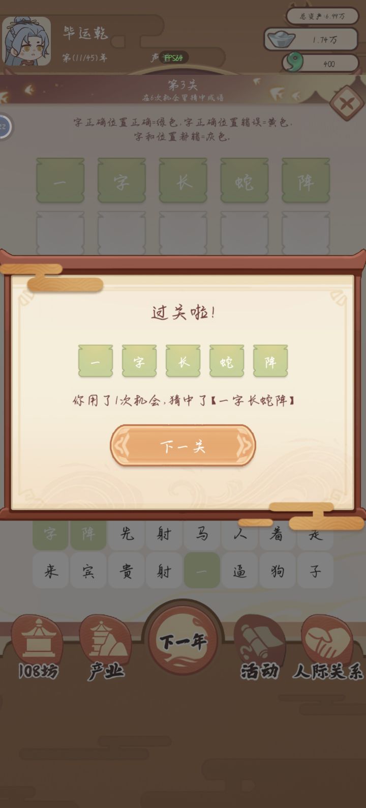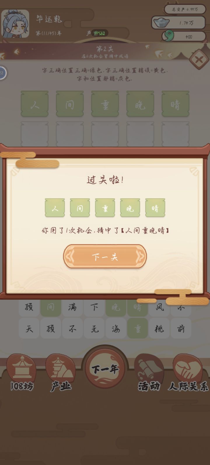 简单做一个小攻略。新手进去先囤字画,字画会涨到五十多万,如果没涨一直下一年,一直等到为止。反复几次后就可以有开马场的钱了。五千万直接开,然后一直买马,推荐蓝色及以上的马(橙色最佳)。有了马以后去比赛,推荐有五个以上橙色再去比赛。比赛完身价会暴涨,尤其是决赛胜利的橙色马,会涨到几亿到十几亿不等。这里注意了,如果已经赚了几亿了(和开局相比),果断快速结束拿勾玉。在天赋里点满“天赋异禀”。有就升级,最