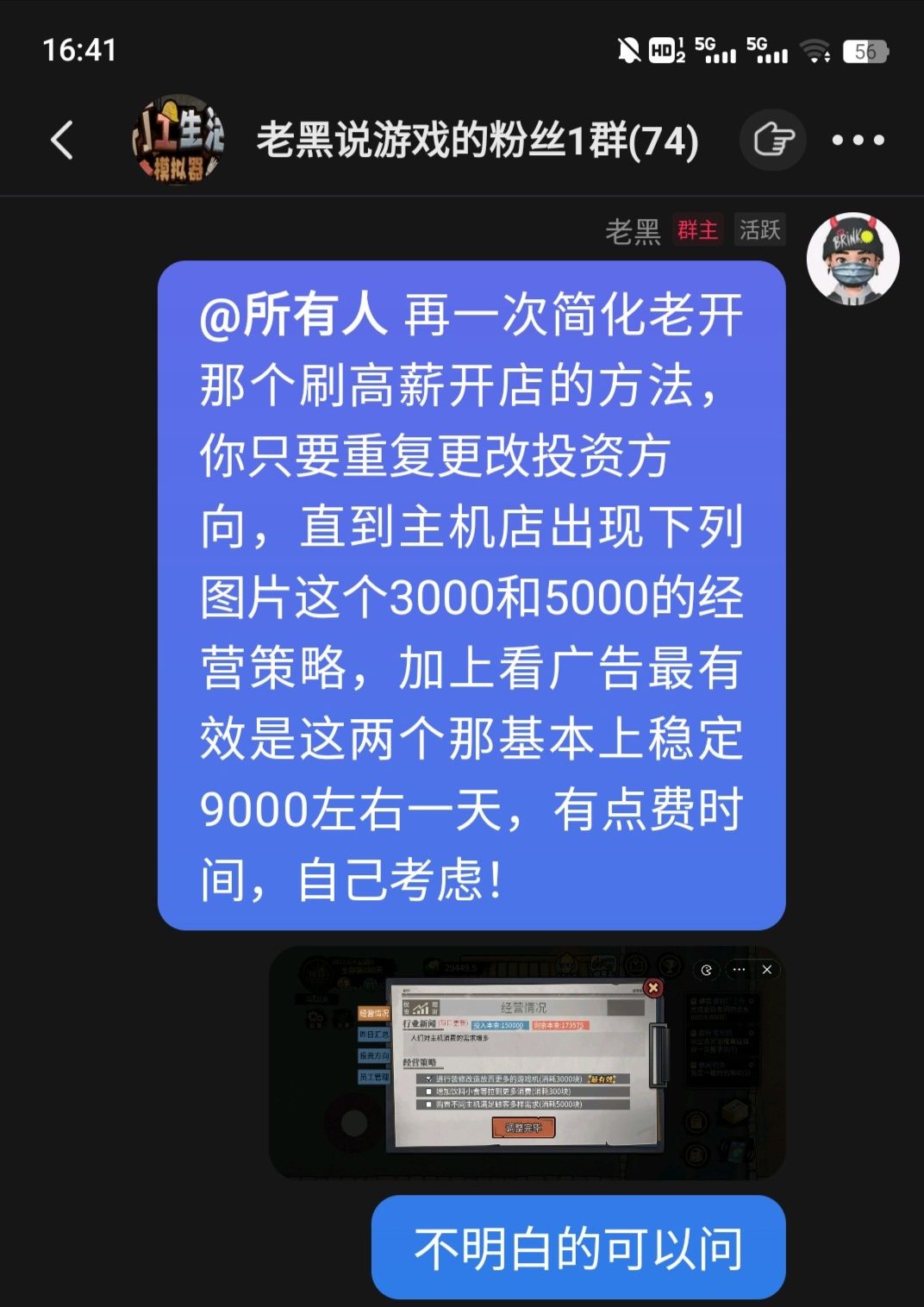 如图,只要是自己开店,你可以在主机店和其他反复更改投资项目,刷出下列图片的,看广告,选项是3000或5000这两个是最有效就可以投,日入6000-12000,其他赚钱攻略可以去抖音关注我,我是专门做打工赚钱攻略的主播,老黑说游戏!