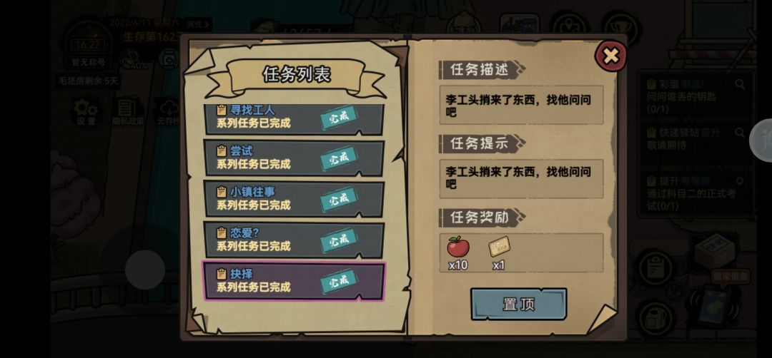 李工头彩蛋任务:进游戏就会触发(如果有其他触发方式欢迎补充),对话后等几天妈妈会托人带苹果来,去李工头那里拿,对话后李工头会给十个苹果和一张土地折扣卷 快递老板彩蛋任务:摇樱花树得到一朵花触发,送给快递女老板,再去摇树得到五朵花十个柳条合成花环送给女老板,最后在任淘买一瓶香水送给女老板,得到一本杂志(目前没发现可用的地方) 服装店彩蛋任务:去钓鱼钓到钥匙,去服装店给店员触发,然后找大学生对话(建议