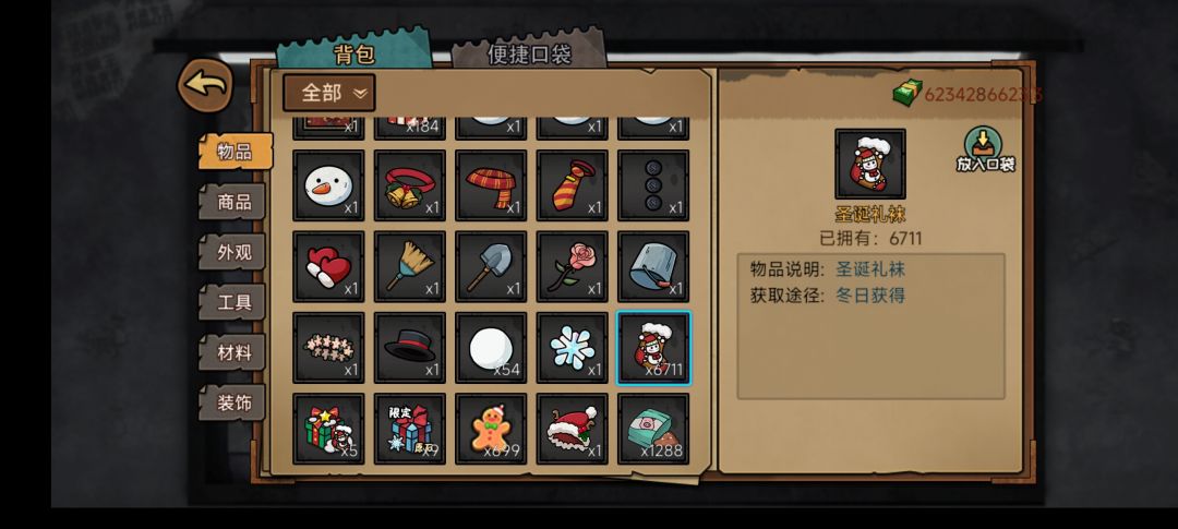 1.如何快速获得圣诞礼袜? 圣诞节版本第一个任务就是需要提交圣诞礼袜,只有提交100/300/500个袜子,才能解锁后续剧情; [表情_微笑]这里我推荐:开铁盒[表情_微笑] 具体操作如下:人物在仓库旁边,然后把铁盒子放在便携口袋里面,打开便携口袋界面,一个一个的去开铁盒子,开到的垃圾直接丢仓库,每开一个铁盒子,都能获得1-8个圣诞礼袜,如果一次性开10个,是没有袜子的; 雪人装扮如何获取? 剧情