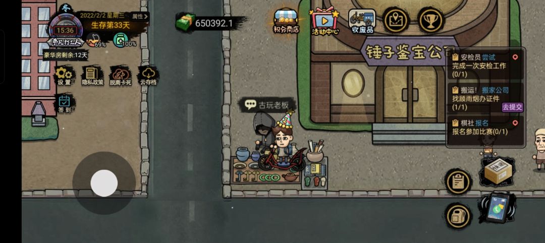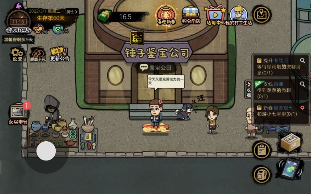 来来说一下,我玩这个游戏,自己遇到的一些不明白的事情 1.禁止通行是沿着河边往上走最上边,红砖,是砖厂上方那个围栏,下一个等级是伐木场,富贵旁边的那条小路,垃圾桶里的发型,是大公园池塘边的那个垃圾桶 2赚钱最前期就搬砖快递,稍微有几百块钱的资本就可以去淘特上买最低价的物品,然后去摆摊,就这样混一段时间,旅店大妈会给你一个做饭的锅。在做饭的锅那里选择烤火鸡那道菜,然后去超市买完食材之后,做完就去中餐