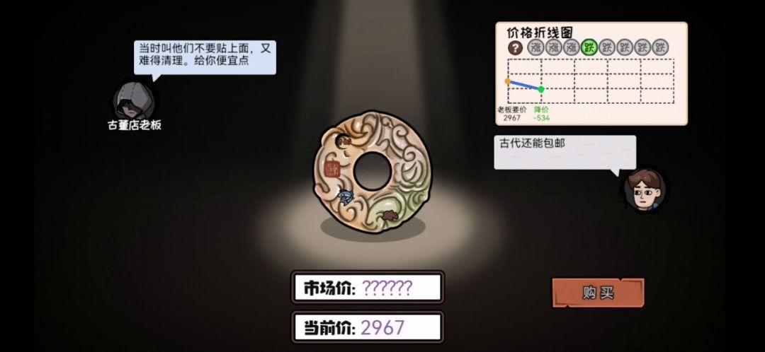 如题,建议运气不好的直接 物品回收!买5-6跌的,讲价基本上都是提示里的(最后一个不确定的不讲价)讲价4次全跌,最低也是小赚,直接卖掉肯定不亏(想赌的,建议鉴定“机会与风险并存”和“要么…要么血本无归”)