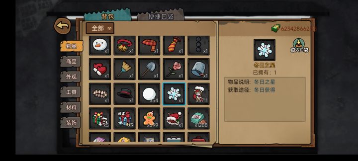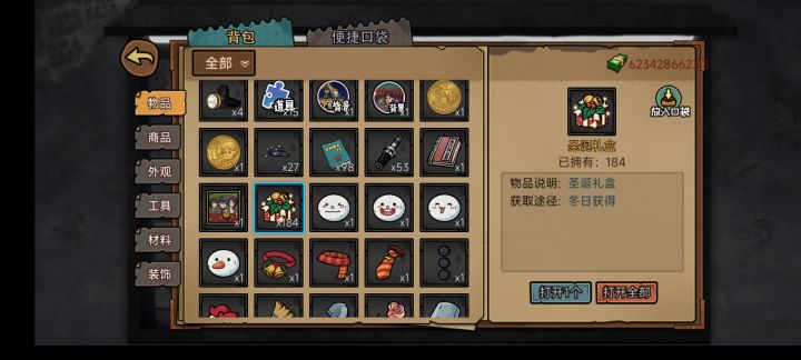 1.如何快速获得圣诞礼袜?圣诞节版本第一个任务就是需要提交圣诞礼袜,只有提交100/300/500个袜子,才能解锁后续剧情;这里我推荐:开铁盒具体操作如下:人物在仓库旁边,然后把铁盒子放在便携口袋里面,打开便携口袋界面,一个一个的去开铁盒子,开到的垃圾直接丢仓库,每开一个铁盒子,都能获得1-8个圣诞礼袜,如果一次性开10个,是没有袜子的;雪人装扮如何获取?剧情